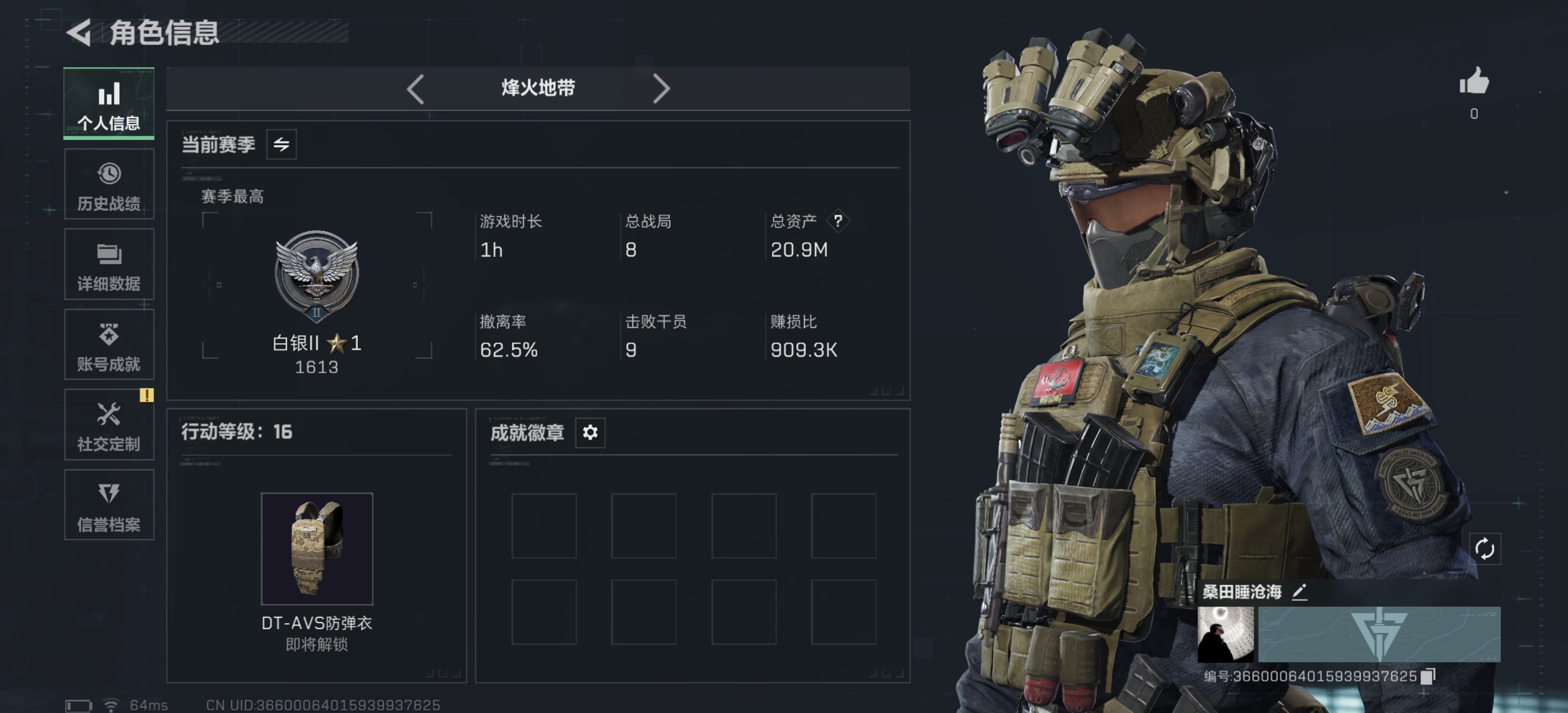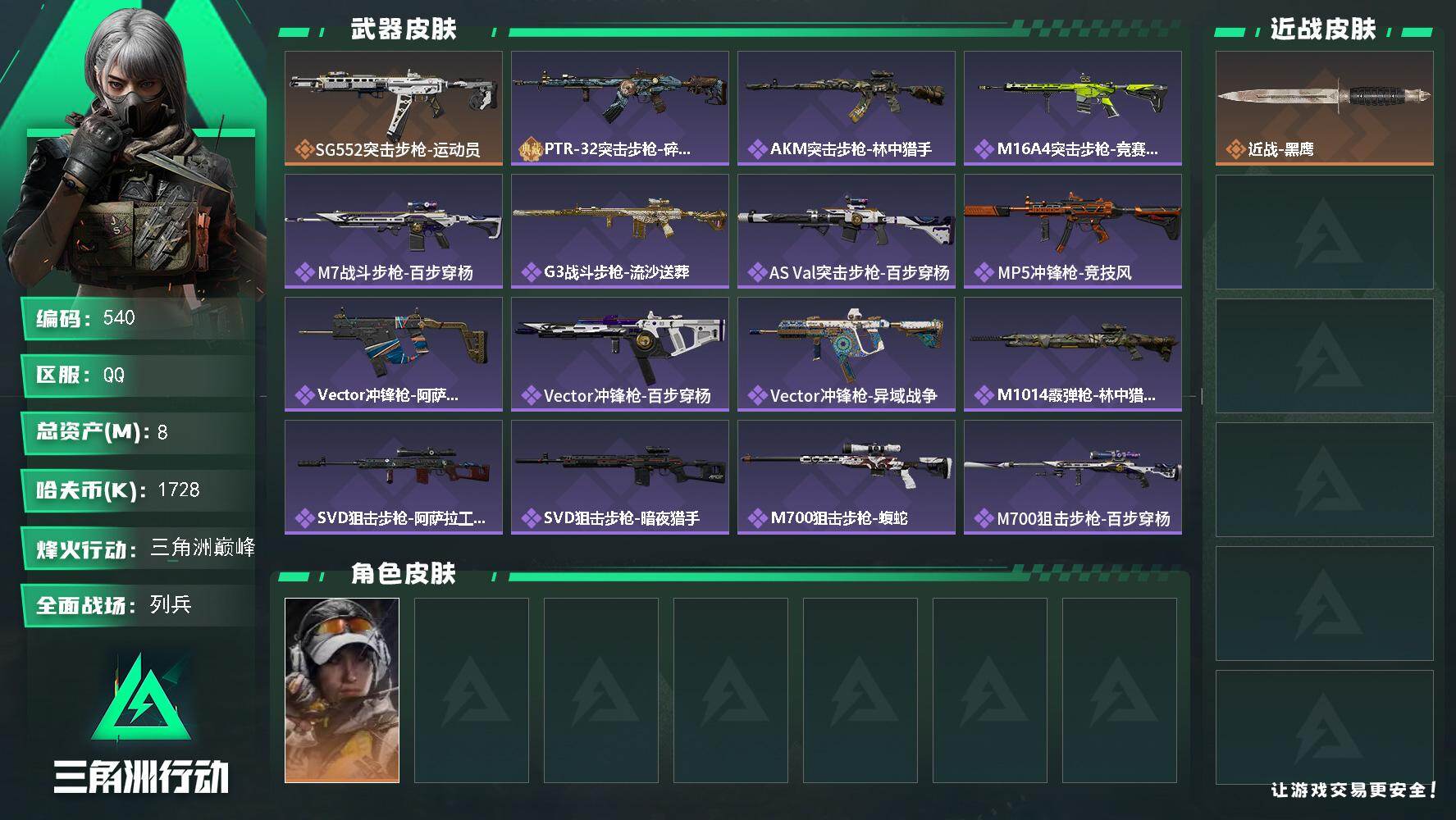 72m总资产-300k哈伏币-60烽火等级-黑鹰-1战场等级-无军衔【干员外