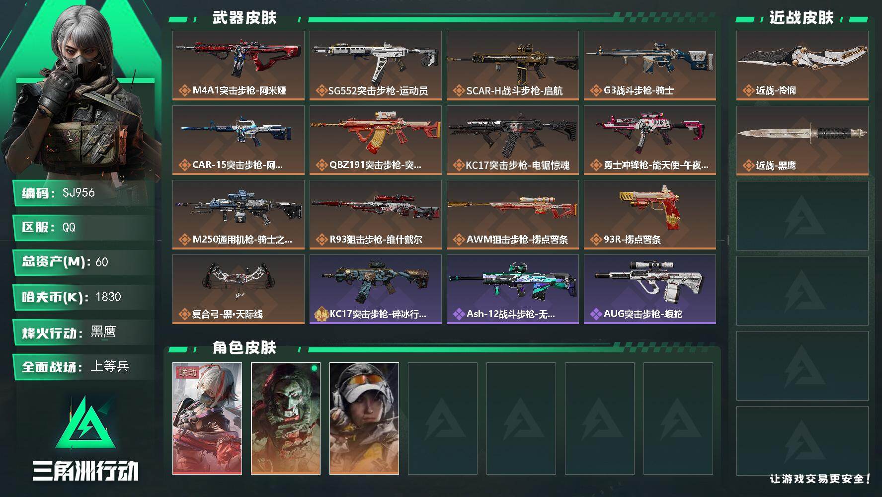 【SJ956】60m总资产-1830k哈伏币-60烽火等级-黑鹰-22战场等级