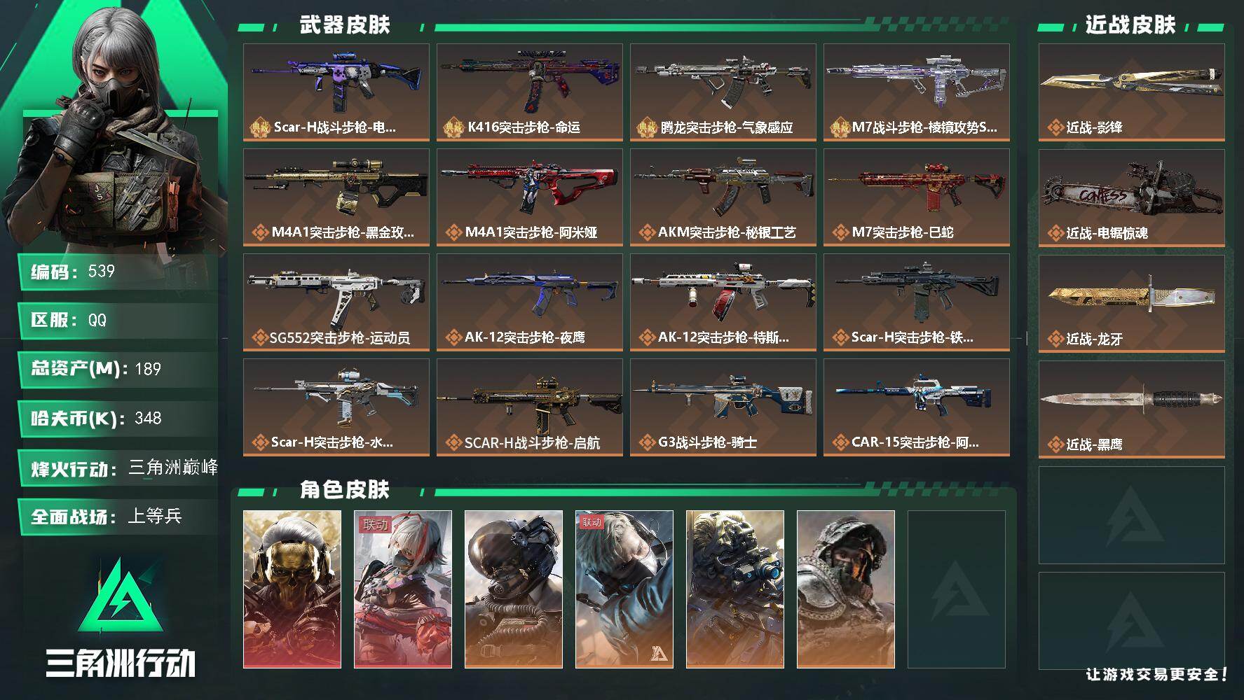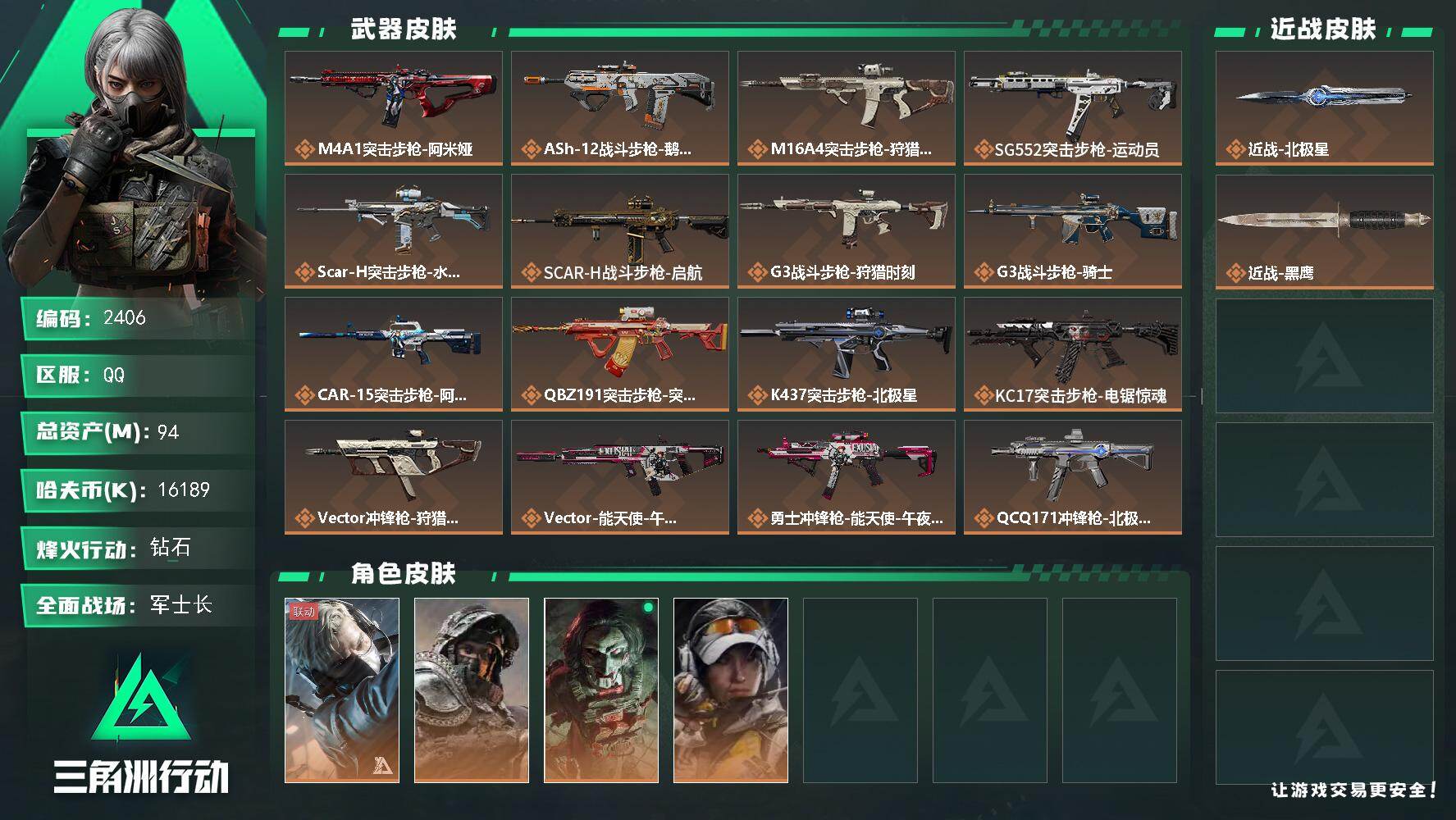 aa15,皮肤金牌射手,三端互通烽火满级,总资产9M,2橙枪,6格,黑鹰匕首,