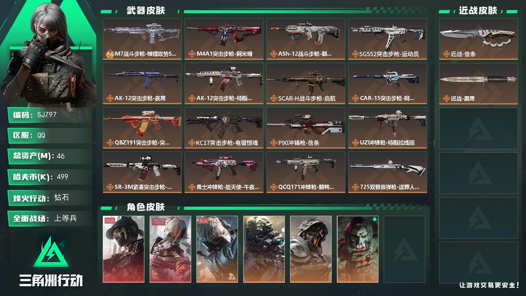 46m总资产-499k哈伏币-60烽火等级-钻石-37战场等级-上等兵【干员