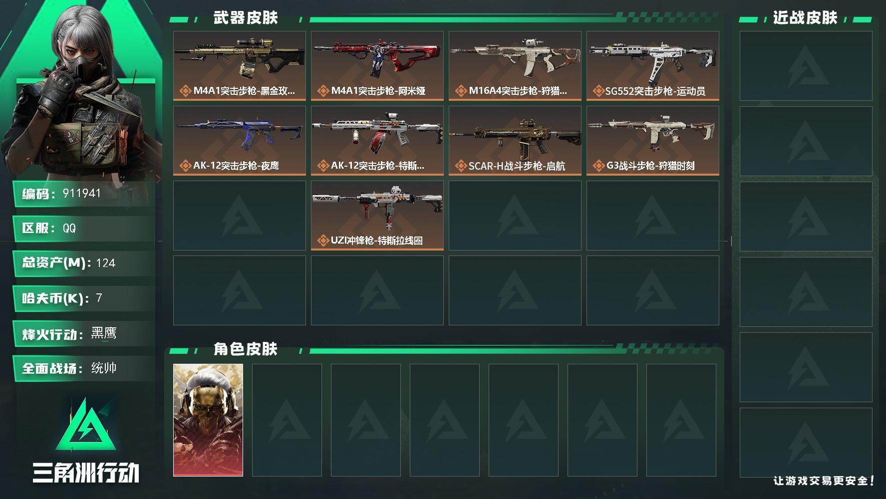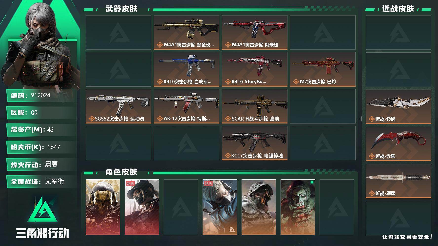 43m总资产-1647k哈夫币-60烽火等级-黑鹰-4战场等级-无军衔【干员