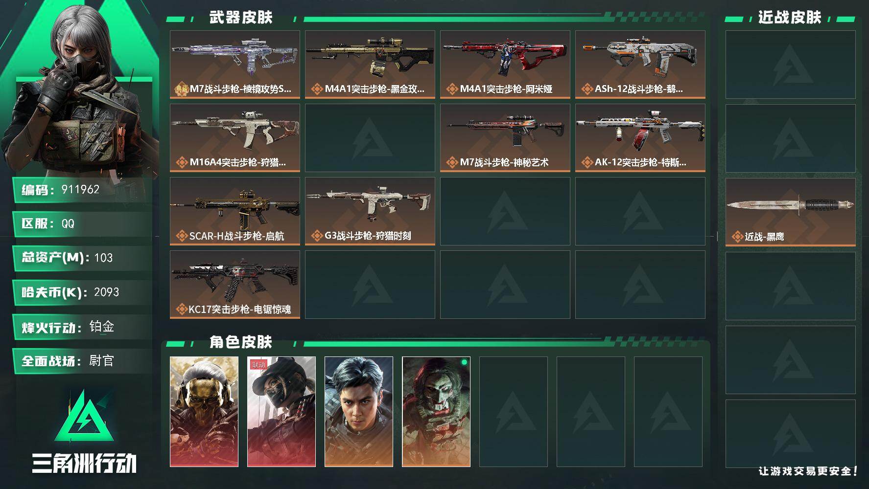 103m总资产-2093k哈夫币-60烽火等级-铂金-50战场等级-尉官
