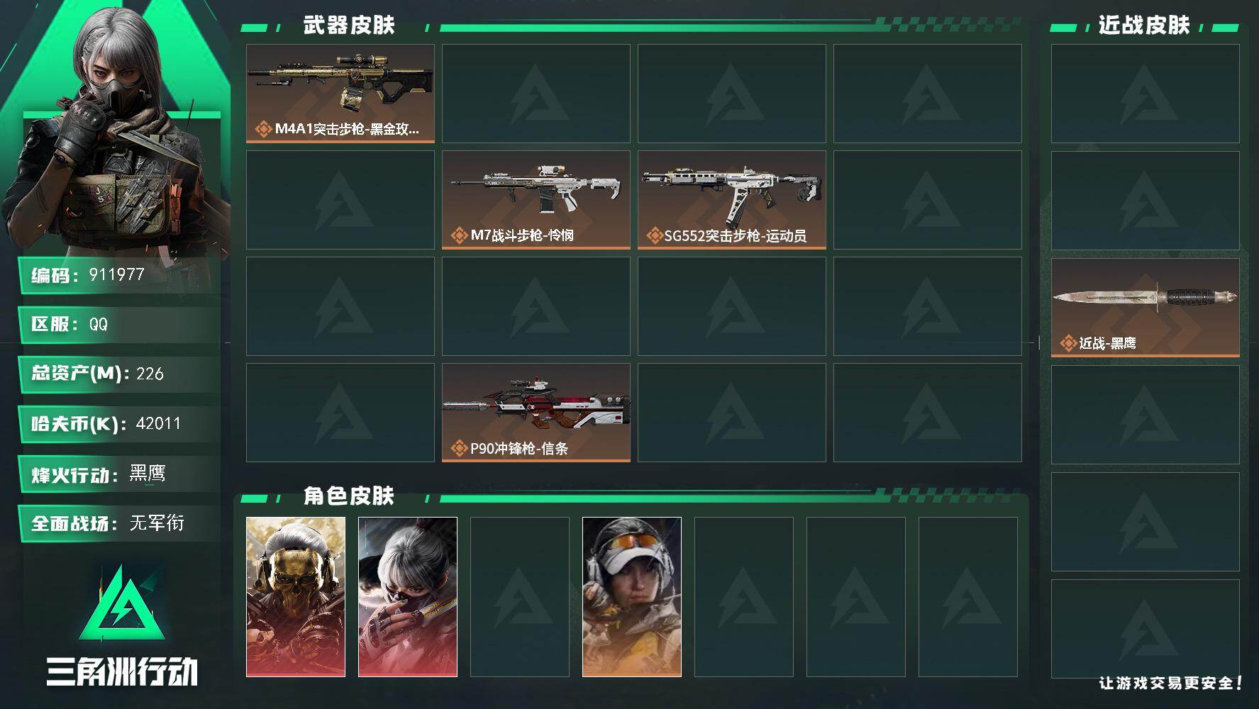 226m总资产-42011k哈夫币-60烽火等级-黑鹰-1战场等级-无军衔【