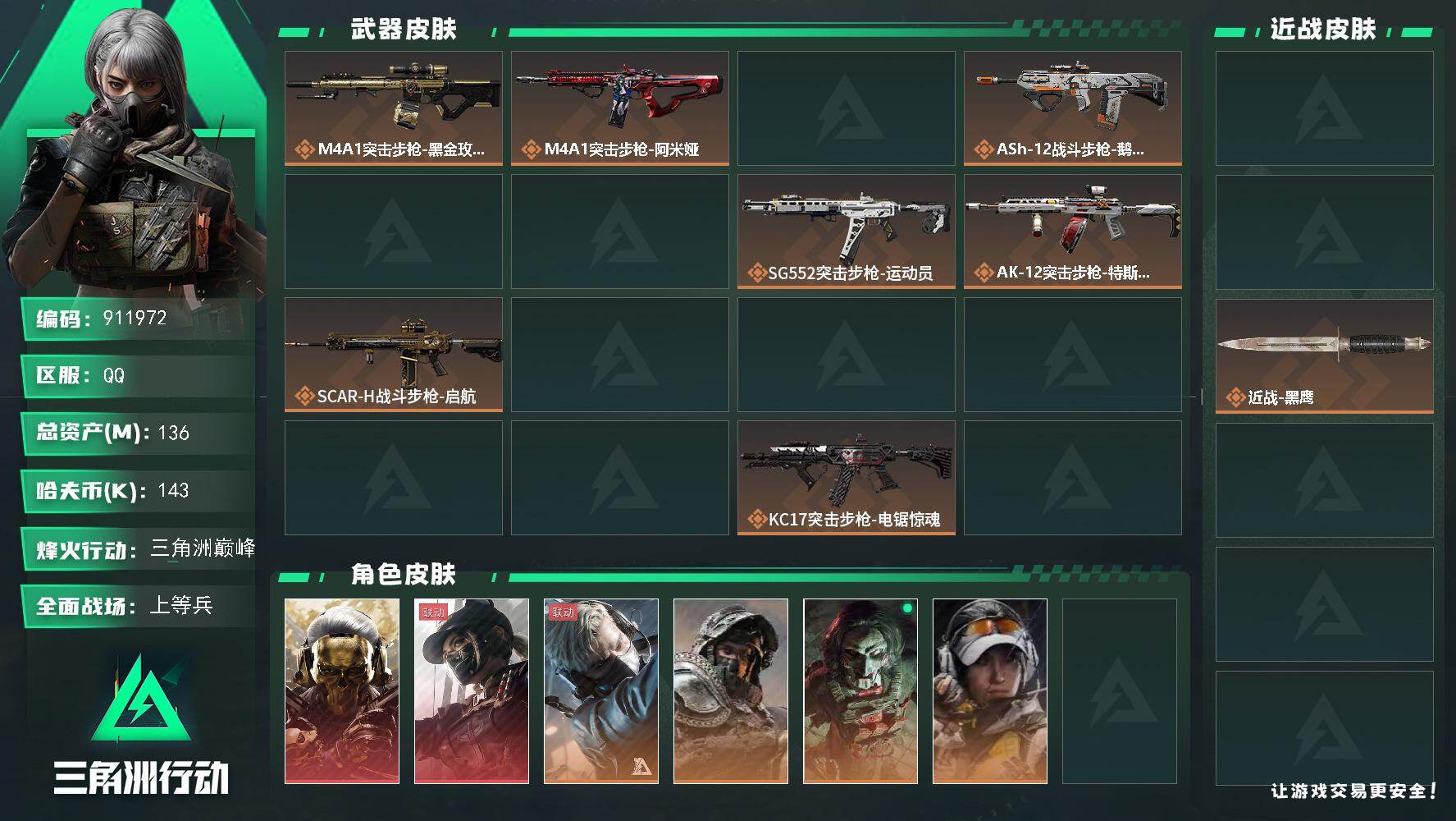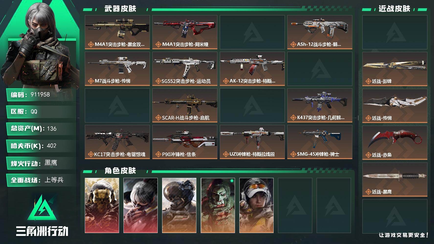 136m总资产-402k哈夫币-60烽火等级-黑鹰-50战场等级-上等兵