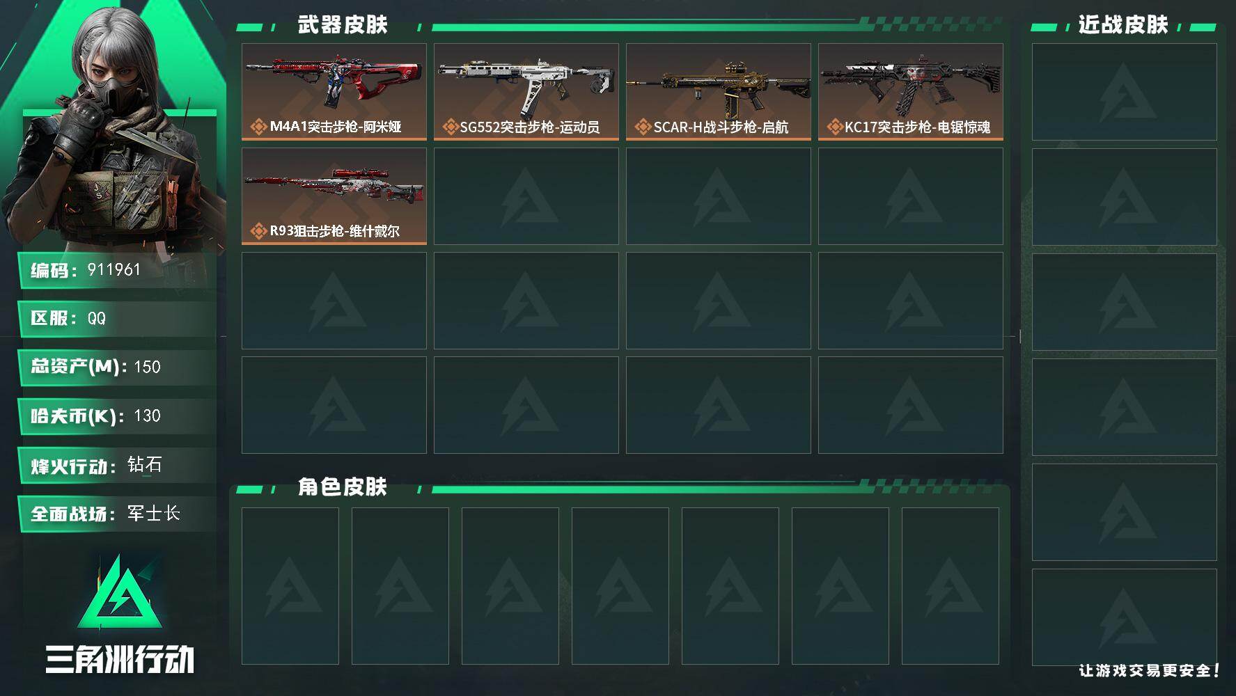 总资产:150.2M 3干员外观 2近战传说 15传说枪械 哈夫币:130.674K 可二次 高级安全箱(3×3)4.11号到期