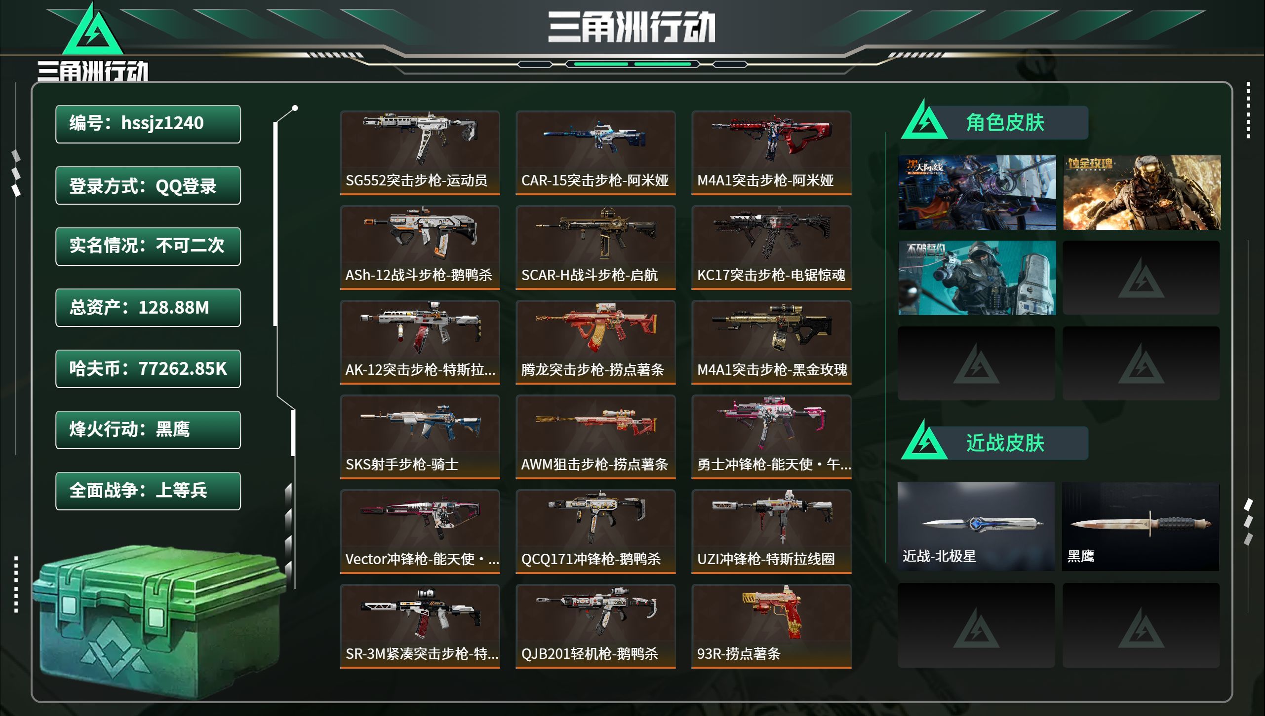 hssjz1240 总资产128.88M,哈夫币 77262.85K,战场等级:23 上等兵,行动等