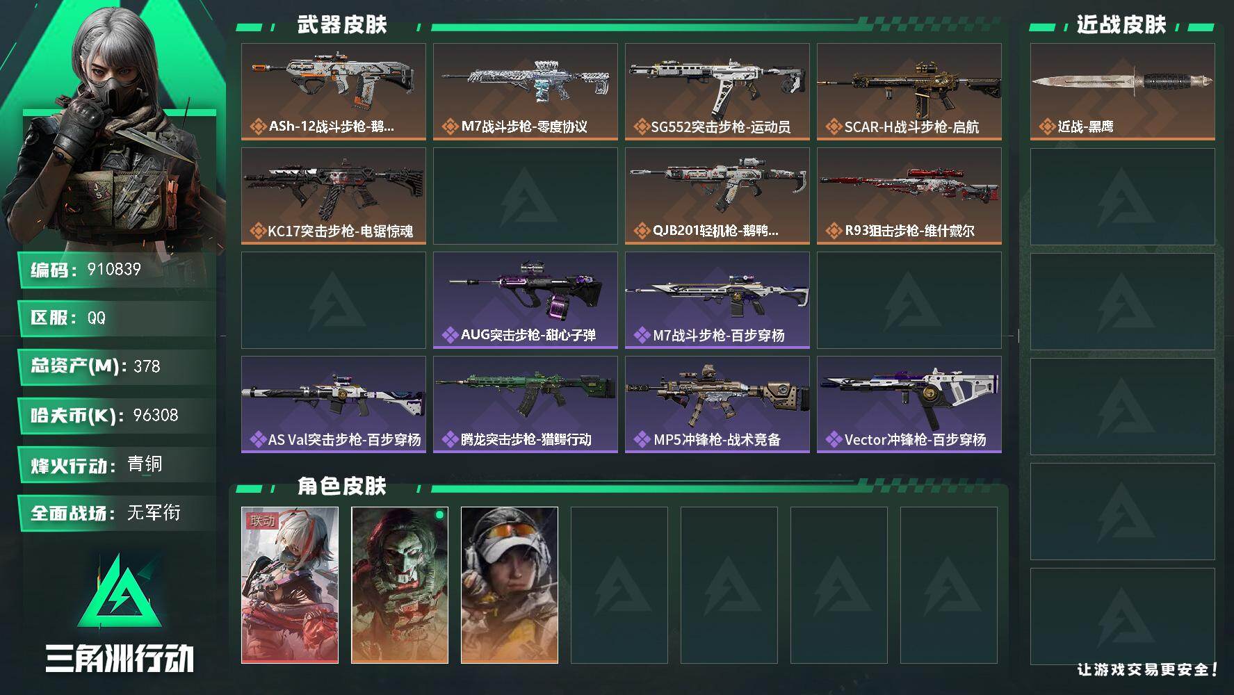 总资产(M):378M/哈夫币(K):96308K/传说枪皮数:8/全面战场等级:1_段位:无段位/烽火地带等级:60_段位:青铜/