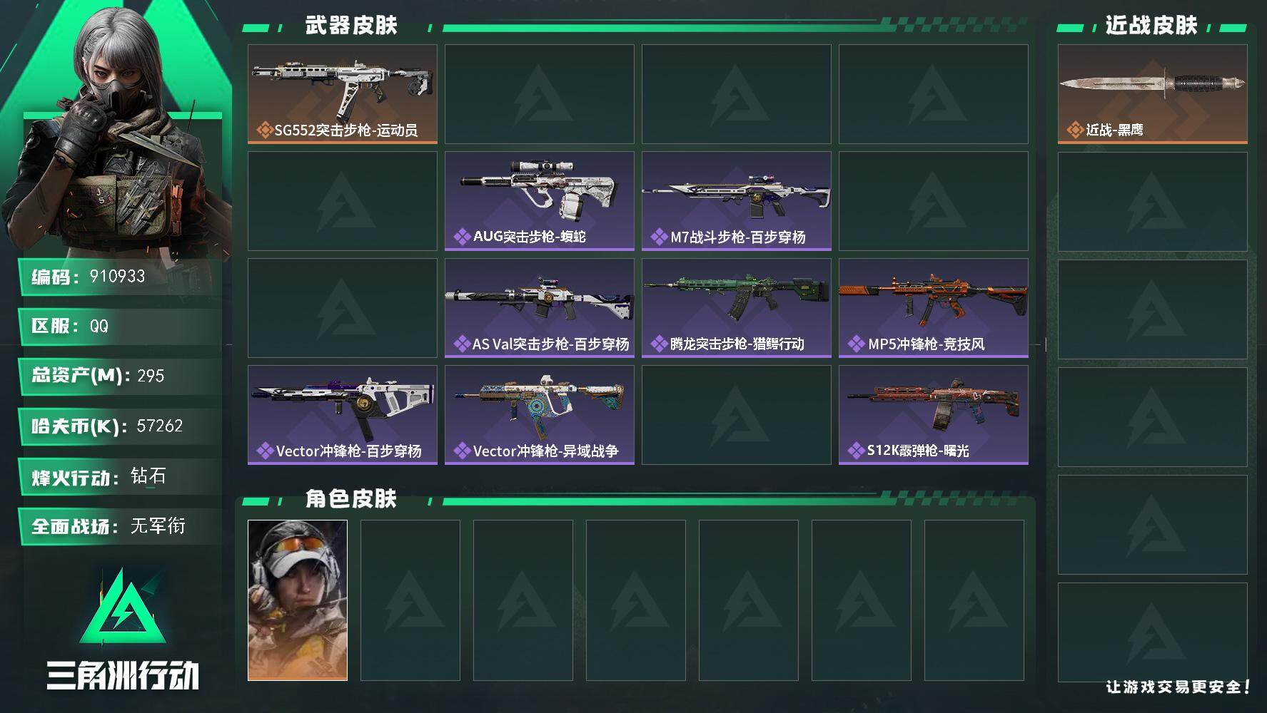 总资产(M):295M/哈夫币(K):57262K/传说枪皮数:3/全面战场等级:1_段位:无段位/烽火地带等级:60_段位:钻石/