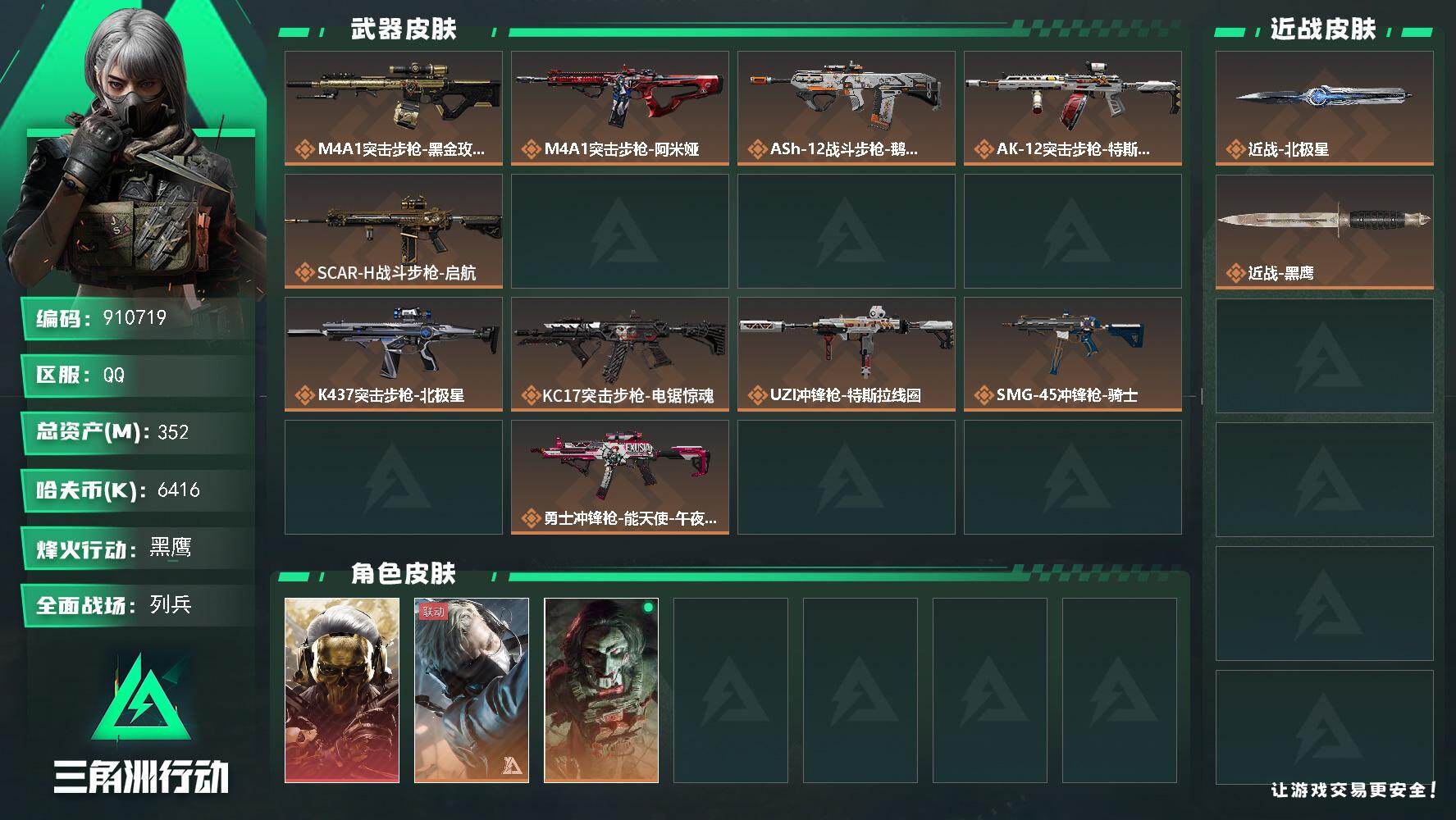 总资产(M):352M/哈夫币(K):6416K/ 传说枪皮数:21/全面战场等级:10_段位:列兵/烽火地带等级:60_段位:黑鹰/