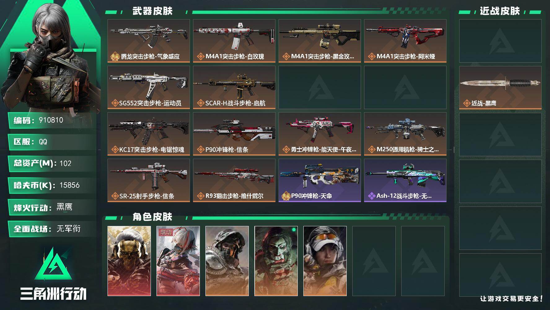 总资产(M):102M/哈夫币(K):15856K/ 传说枪皮数:14/全面战场等级:4_段位:无段位/烽火地带等级:60_段位:黑鹰/