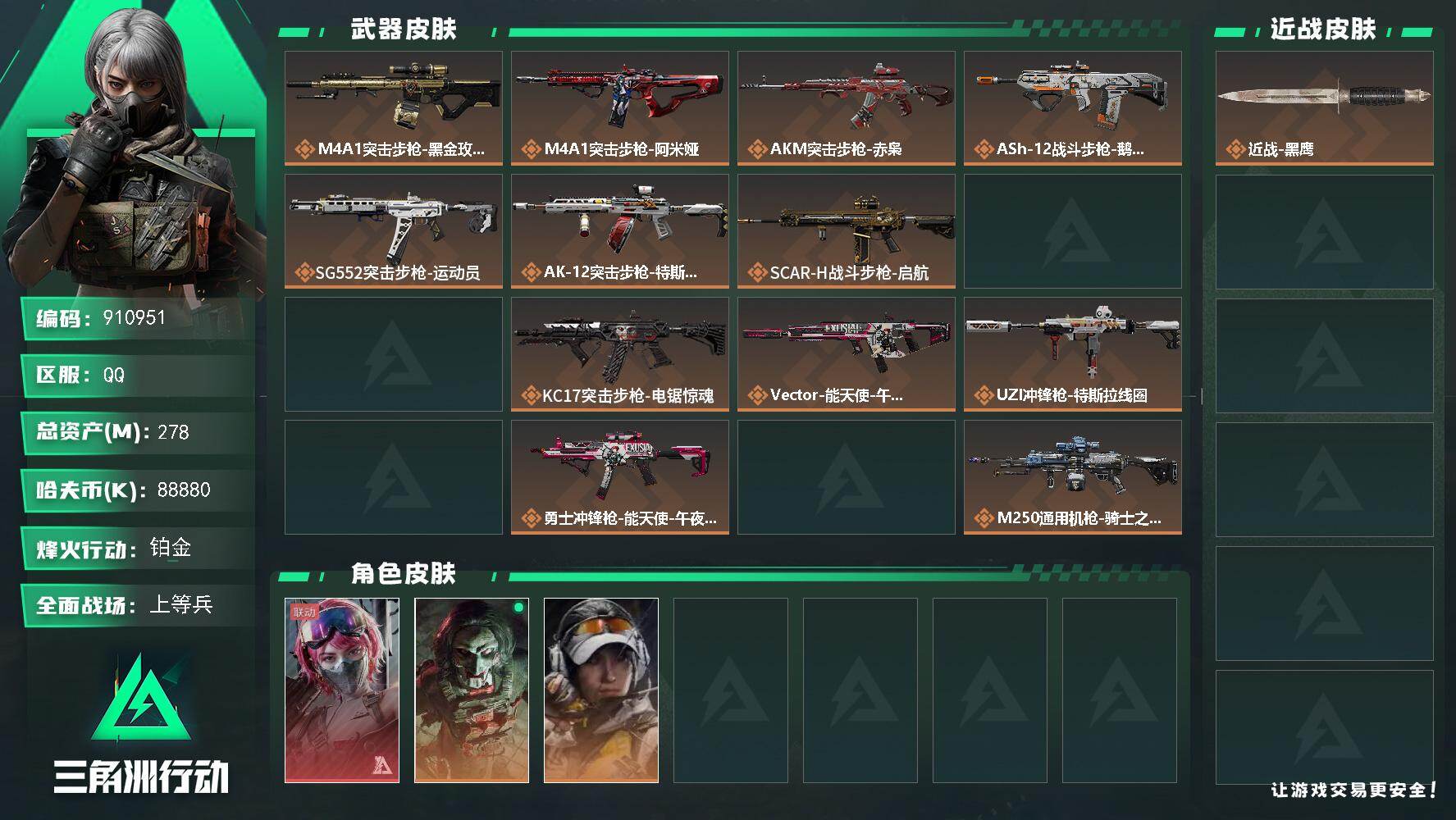 总资产(M):278M/哈夫币(K):88880K/传说枪皮数:21/全面战场等级:28_段位:上等兵/烽火地带等级:60_段位:铂金/