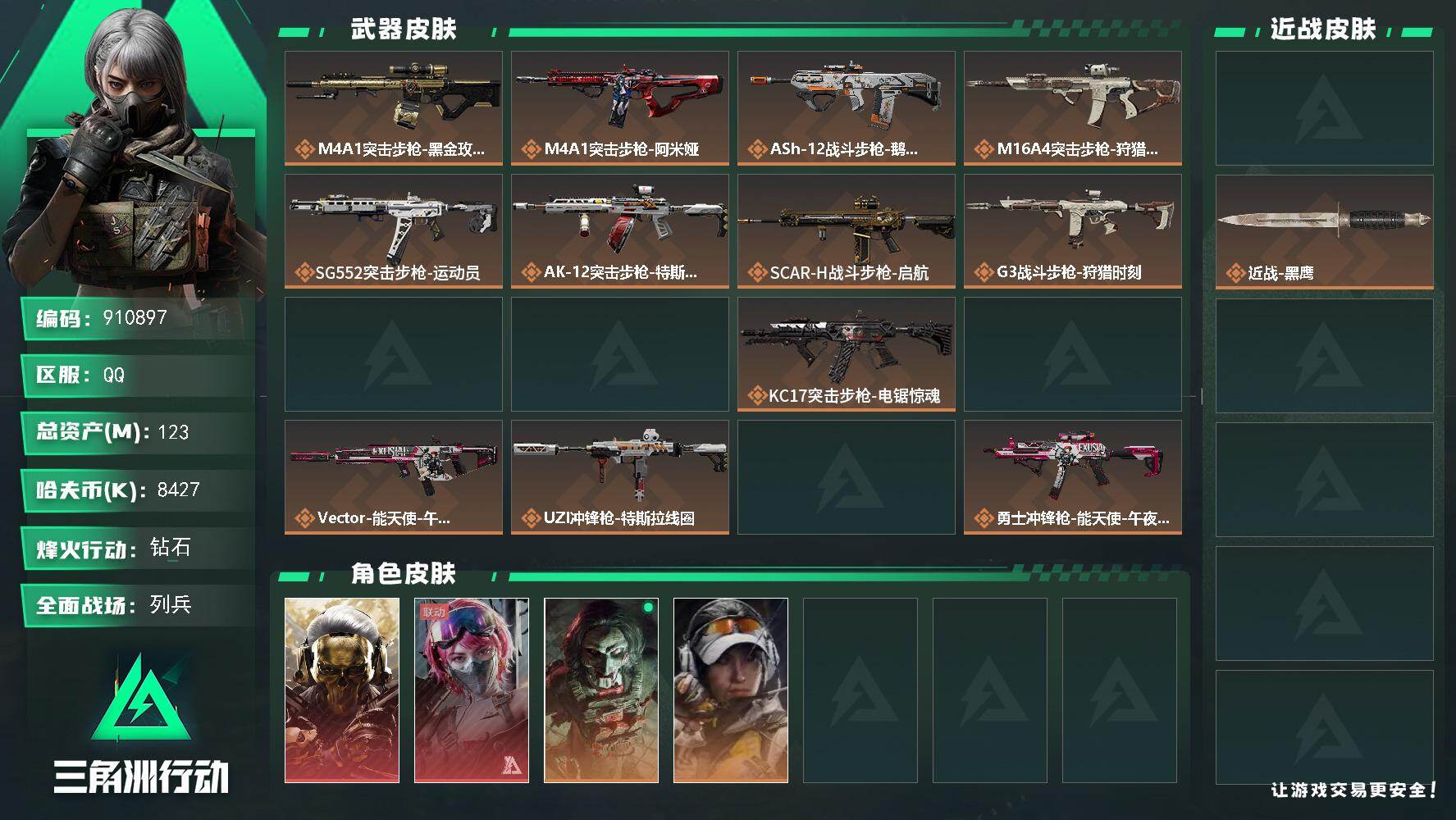 总资产(M):110M/哈夫币(K):51312K/传说枪皮数:9/全面战场等级:9_段位:列兵/烽火地带等级:55_段位:钻石/