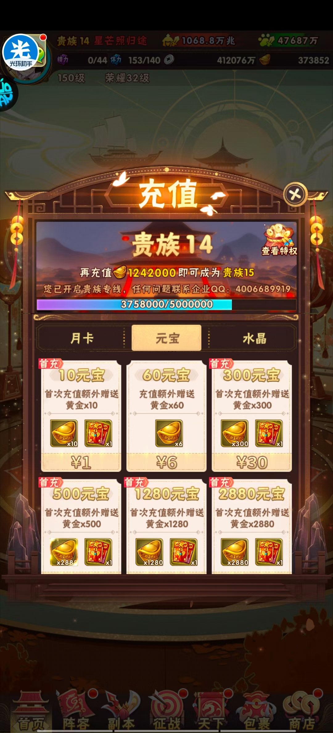 元宝30万,一星梵金军师,梵金武将,战力9万亿,等级145,霸区第一名,适合养老