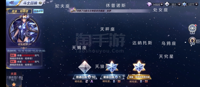 圣斗士星矢(腾讯)【安卓QQ】83区1277高星14505钻石,神修罗神射手死神德芙雅典娜,红卡夜宵帕蒂塔传奇召唤中