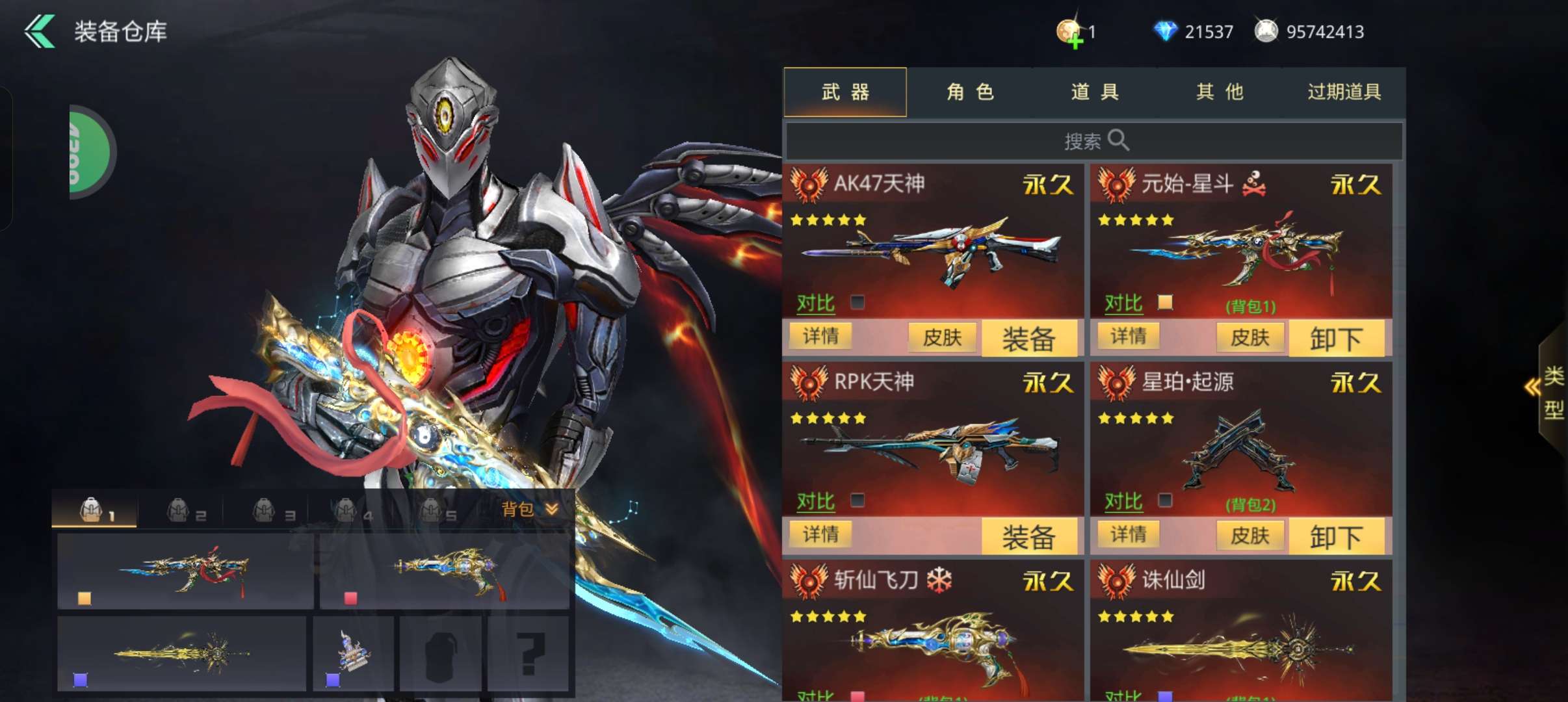 武器很多差不多350个武器,SVIP8,充值了很多,有变异体45个,角色很多,还有两个机甲,翅膀传说