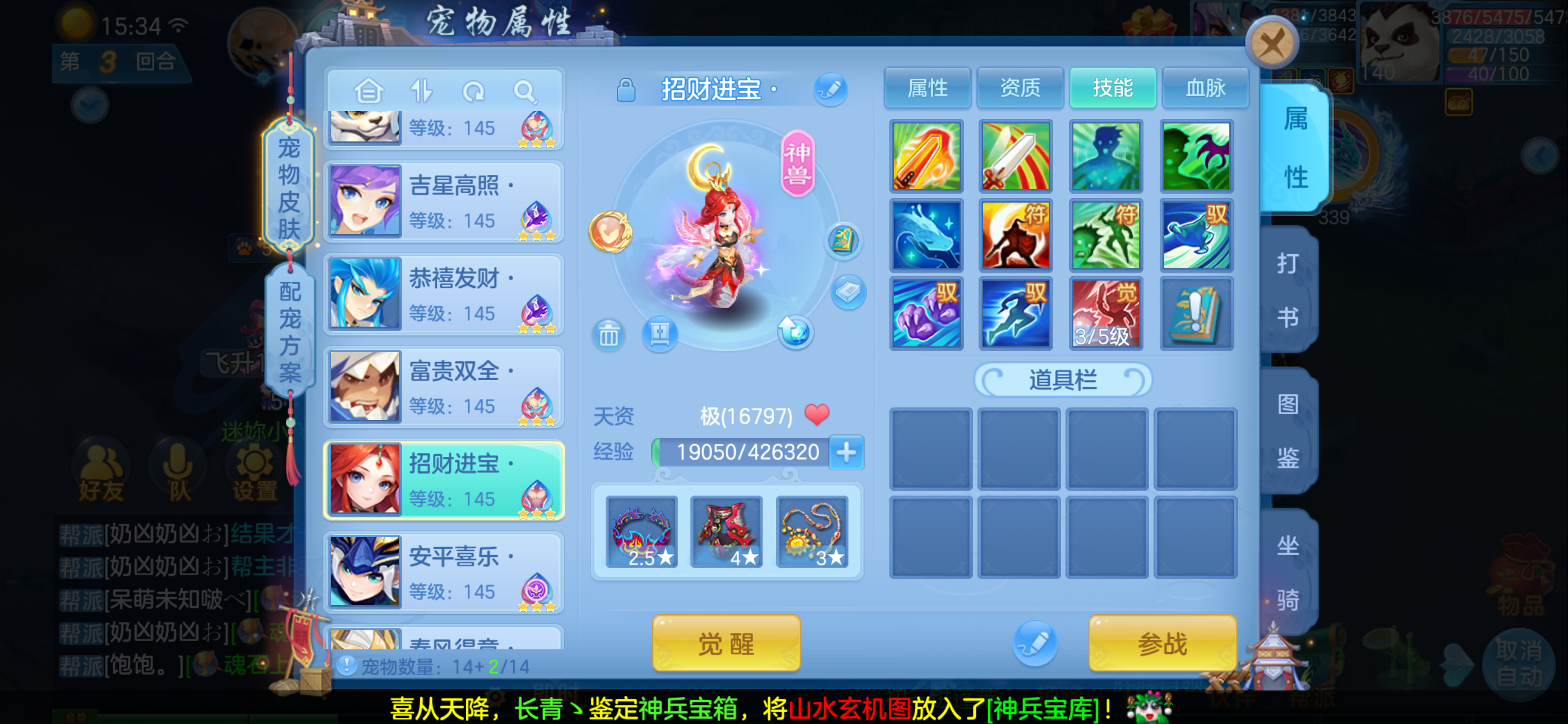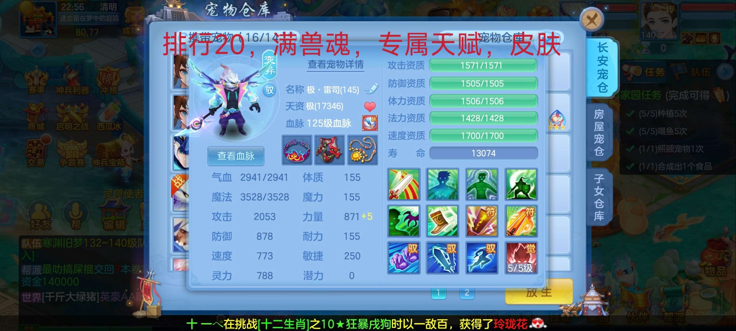 飞花逐月140男天策 14段4星,带仙双神,宝宝14只➕成品,装备平均单加43,易必杀武器,易乱棍