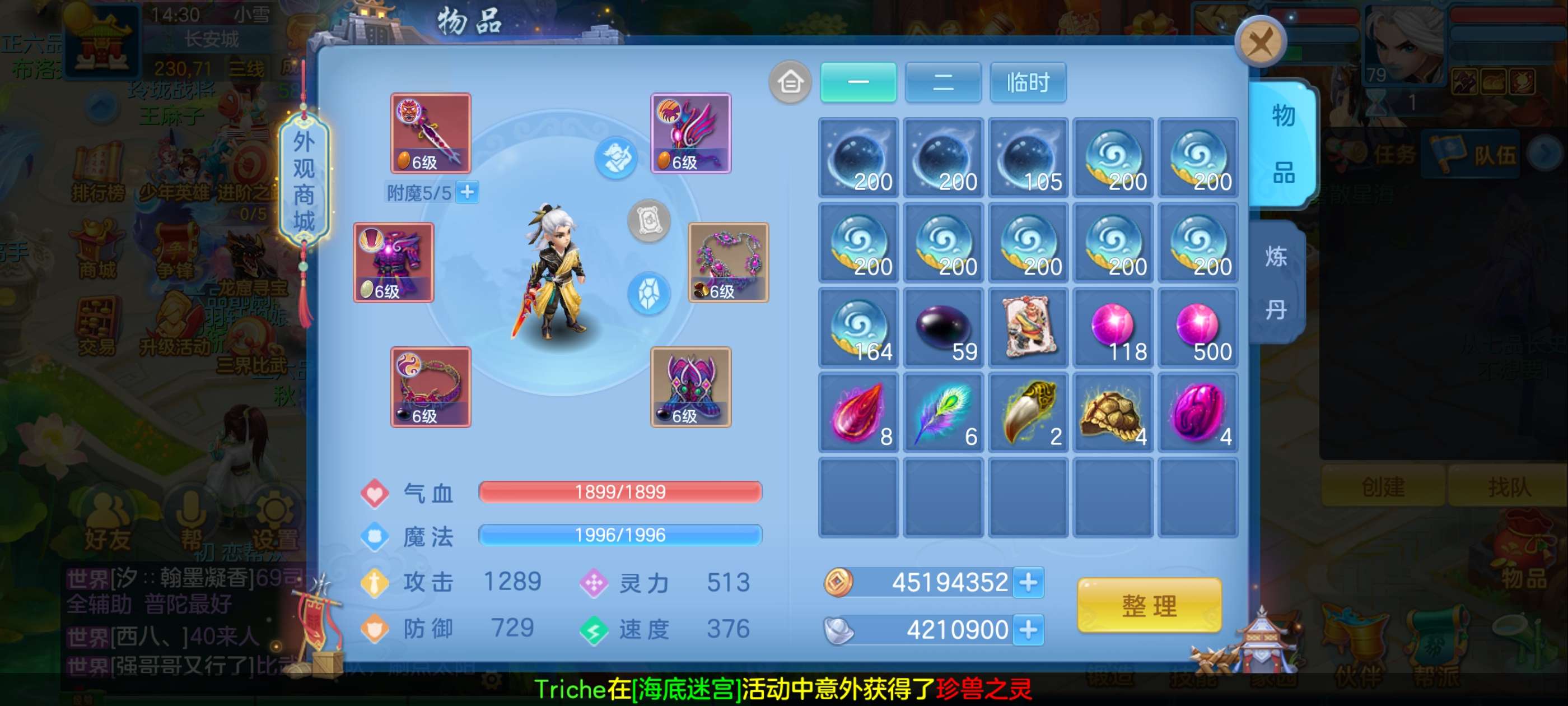 今年勇109女普陀,2仙兽2强化,13段,可转法封,激励易成长衣服,愤怒易成长腰带,疾速易成长帽子,笑里易成长项链。2只内丹强化神,迅捷慈航鞋子,26只满兽魂宝宝,14个专属天赋,庄园,2980邮箱,无双重