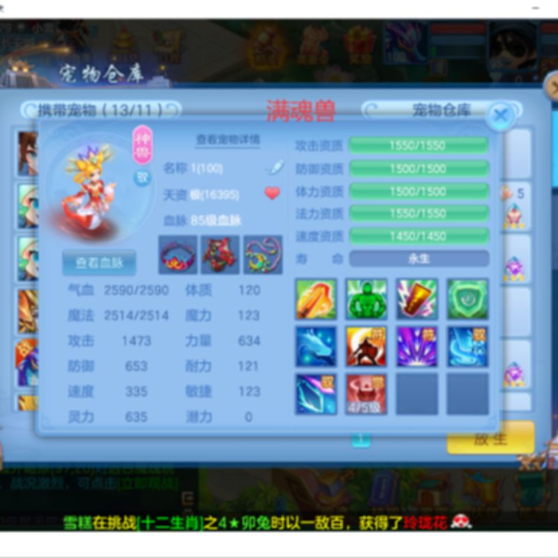 (95万兽/男)叱咤风云/一年换绑/有双----5件12段2件11段,易成长,神器腰带,双神兽(满魂内丹蛇),7个6多特殊5,8红6黄3专属血脉,5个宝宝皮肤,高级坐骑,仓库还有32颗神兽丹,2695成就