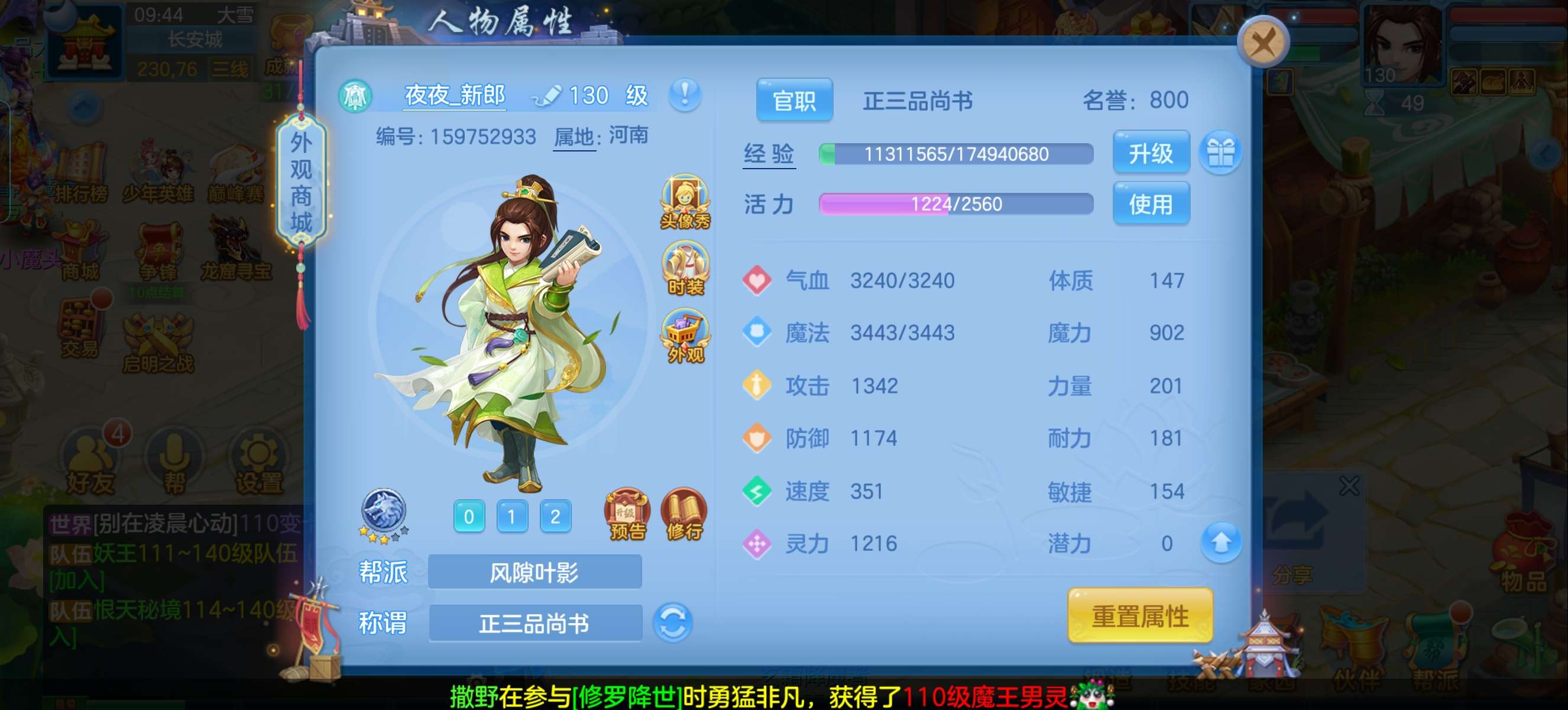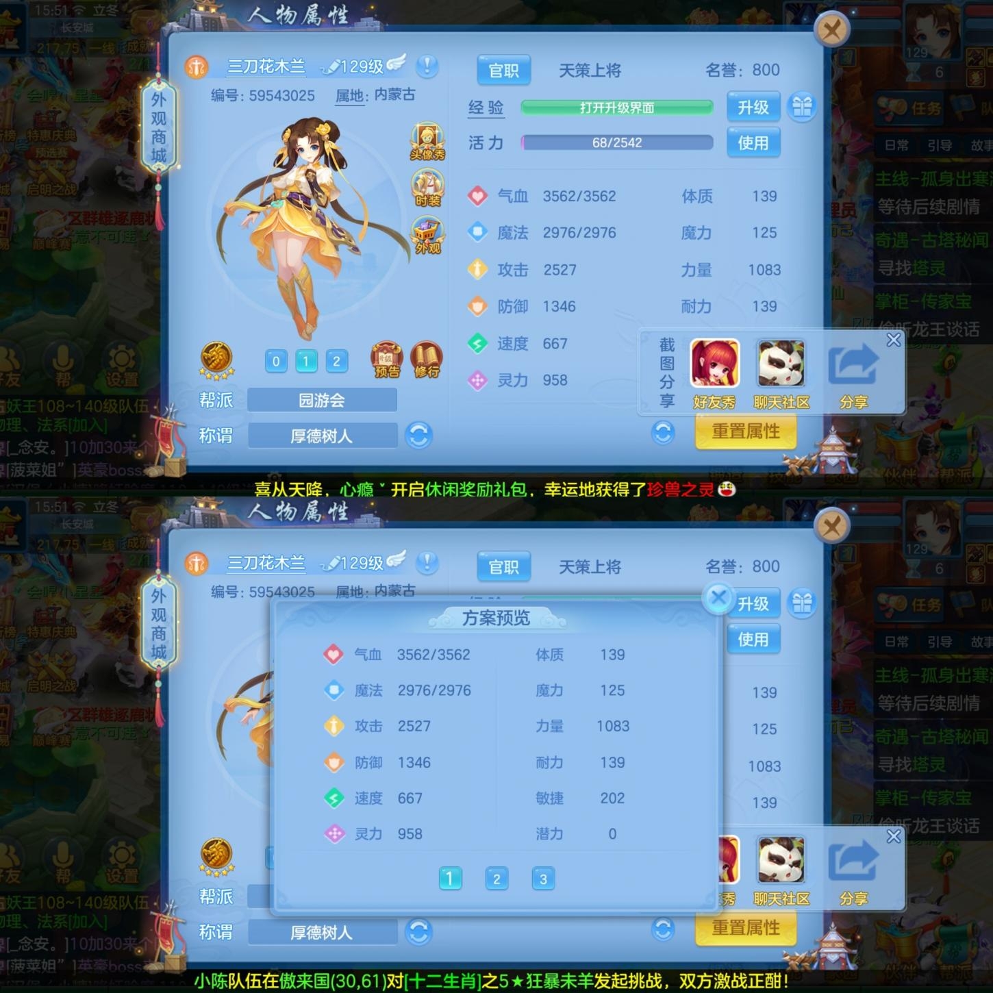 (140魔王/女)花好月圆/邮箱不送/一年换绑★无双重★3件12段1件11段2件10段,易成长,5个6技能,3珍兽,有个满魂钧邪,带800万银子,有15000积分,仓库还有很多高书,元宵,变身卡,双倍充值也还有,2626成就
