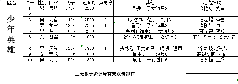 少年英雄 65男明月 146w银子资源