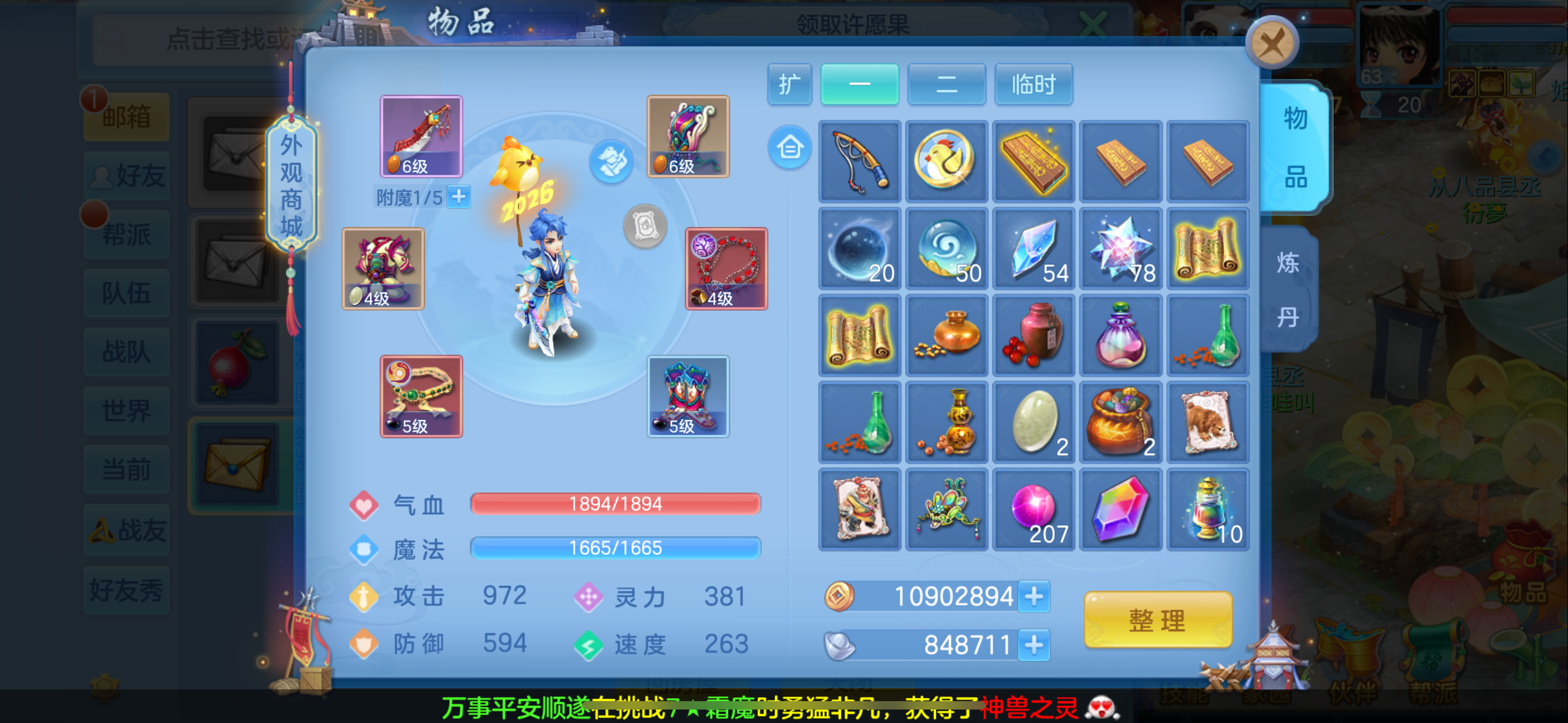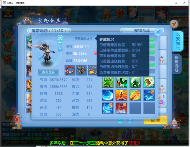 周年相伴09男魔王庄园,1仙三神六满兽魂,差个一百多万银子就满段了。其余看图