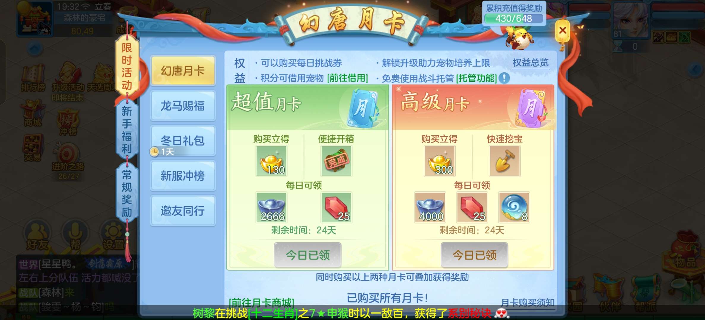 有高级坐骑双武器,金还有900多,双月卡20多天