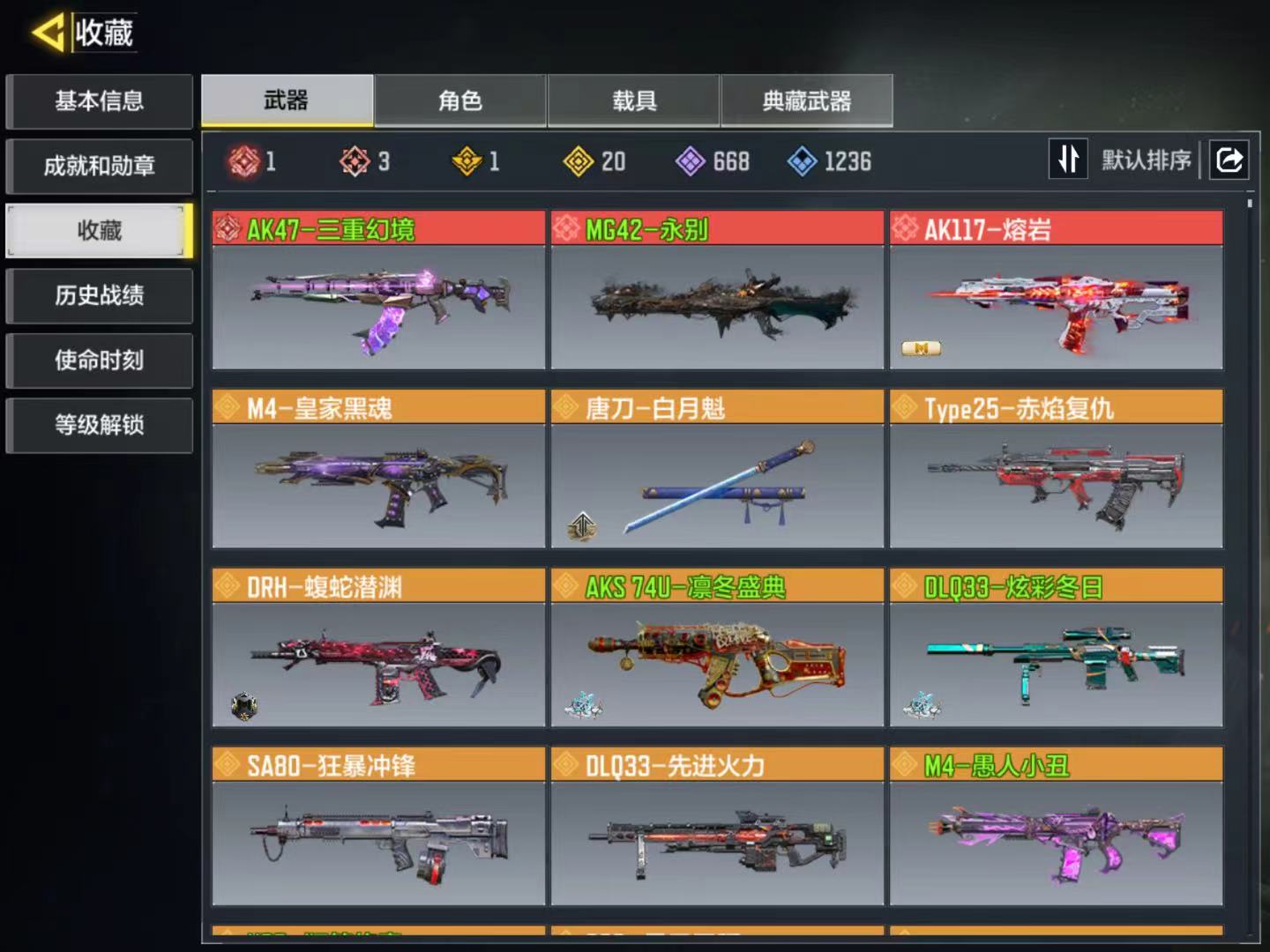 三神话 二十橙皮 六百多紫皮 满级三重幻境 四级MG42永别 唐刀 圣诞狙 先进火力 法老 黑罗兹