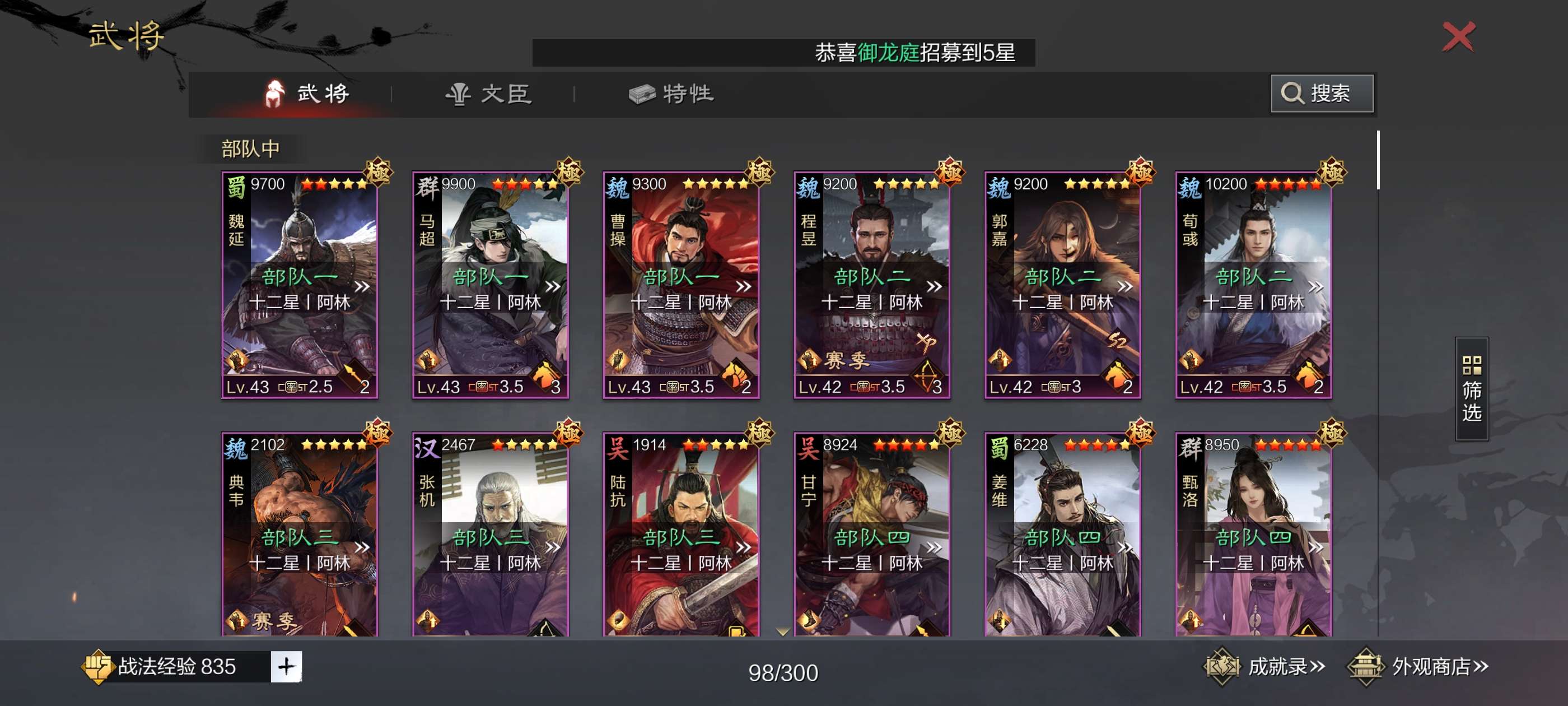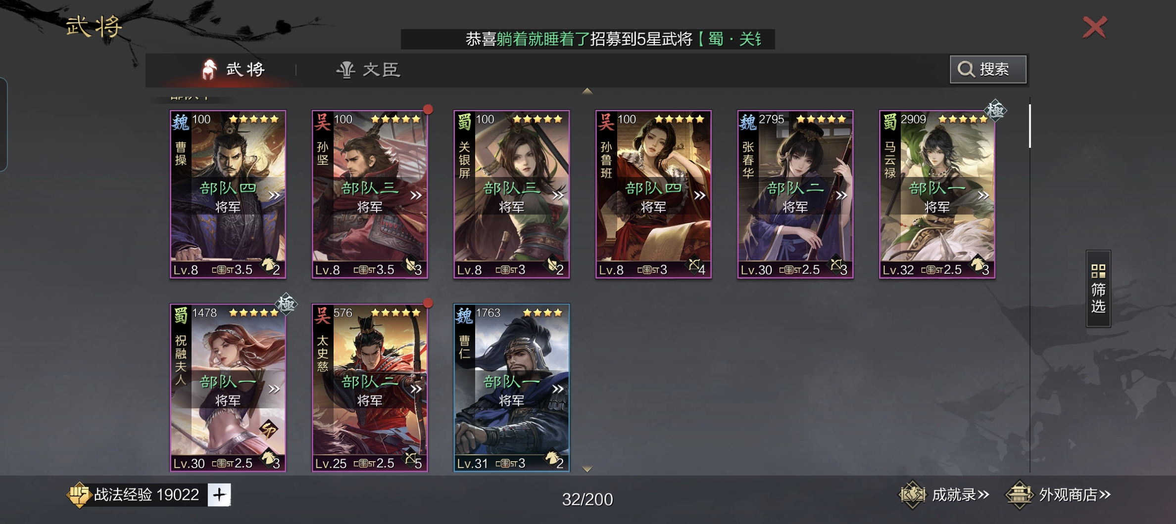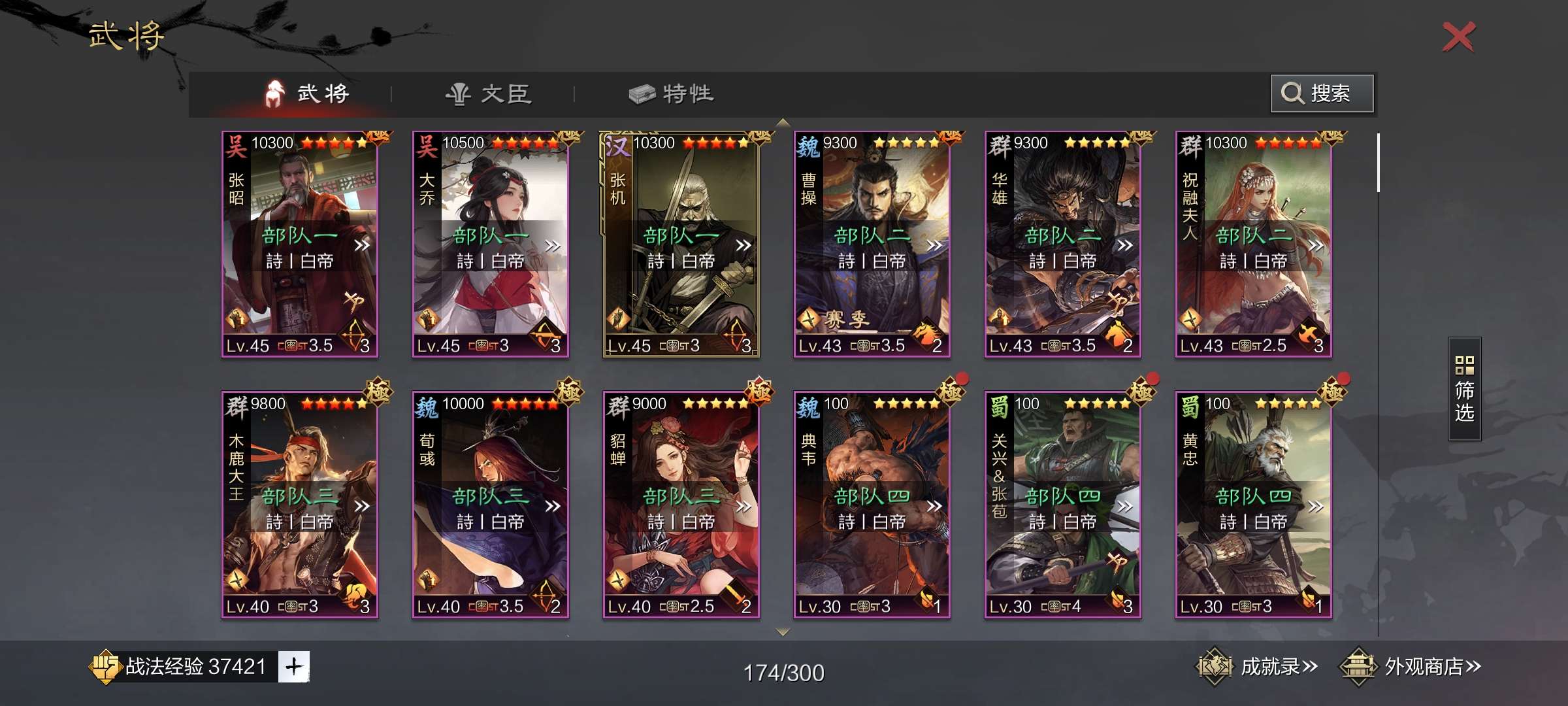 官服试师,满红sp姜维一红张机程昱王异孙权,二赛季限定武将都有,第二张图是附带的小号在同一个