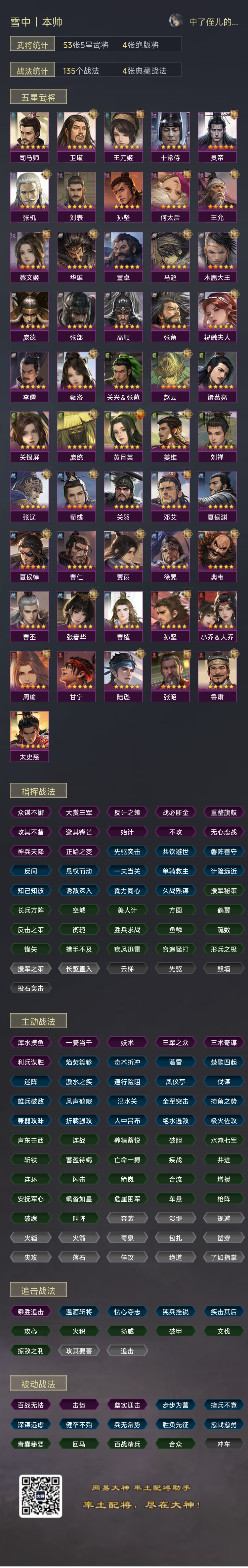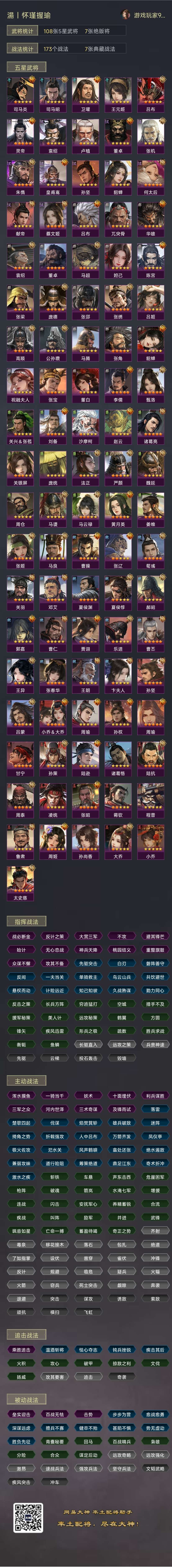 武将,典藏战法,很齐全!值得考虑入手体验!曹操,刘备,司马炎,孙权四黄齐全!核心战法都有!