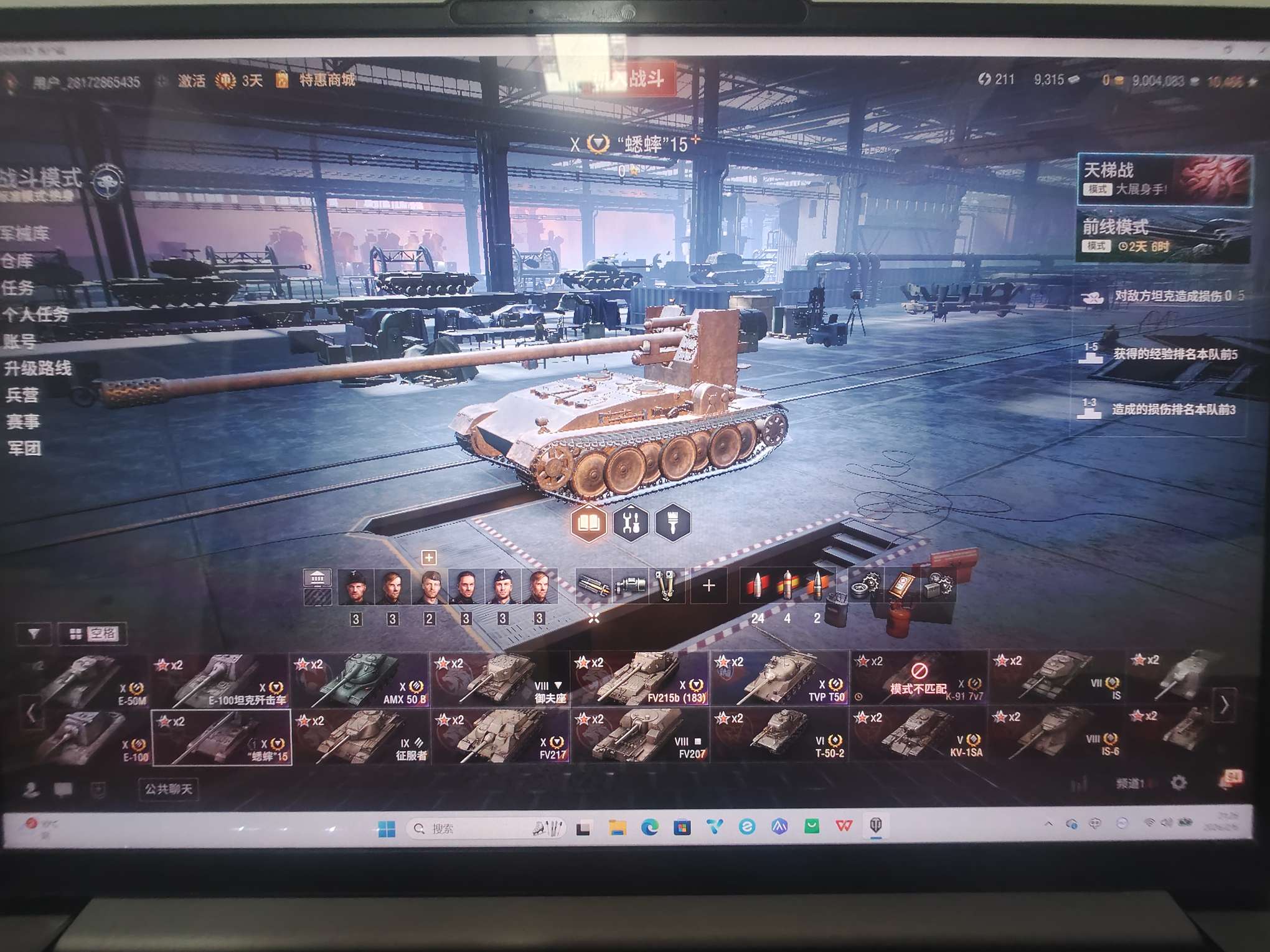 坦克世界账号4005、E100坦克歼击车银币1000万、债券15000、金币2850