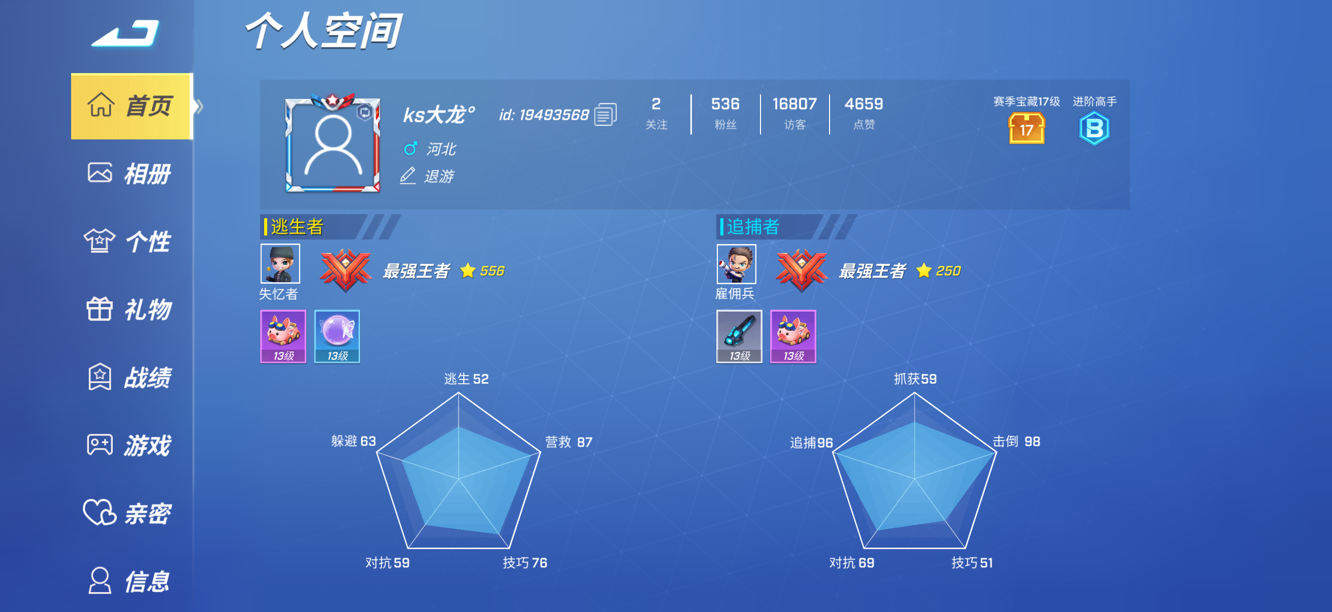 4399版本 逃跑老号 ss1冰雪王子 孙悟空 超多道具皮肤 全角色 逃生者王者120星 238出