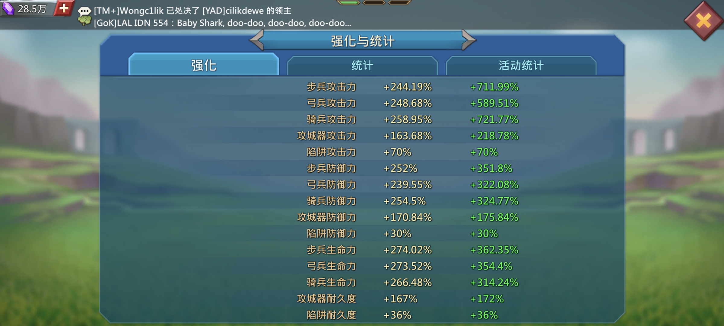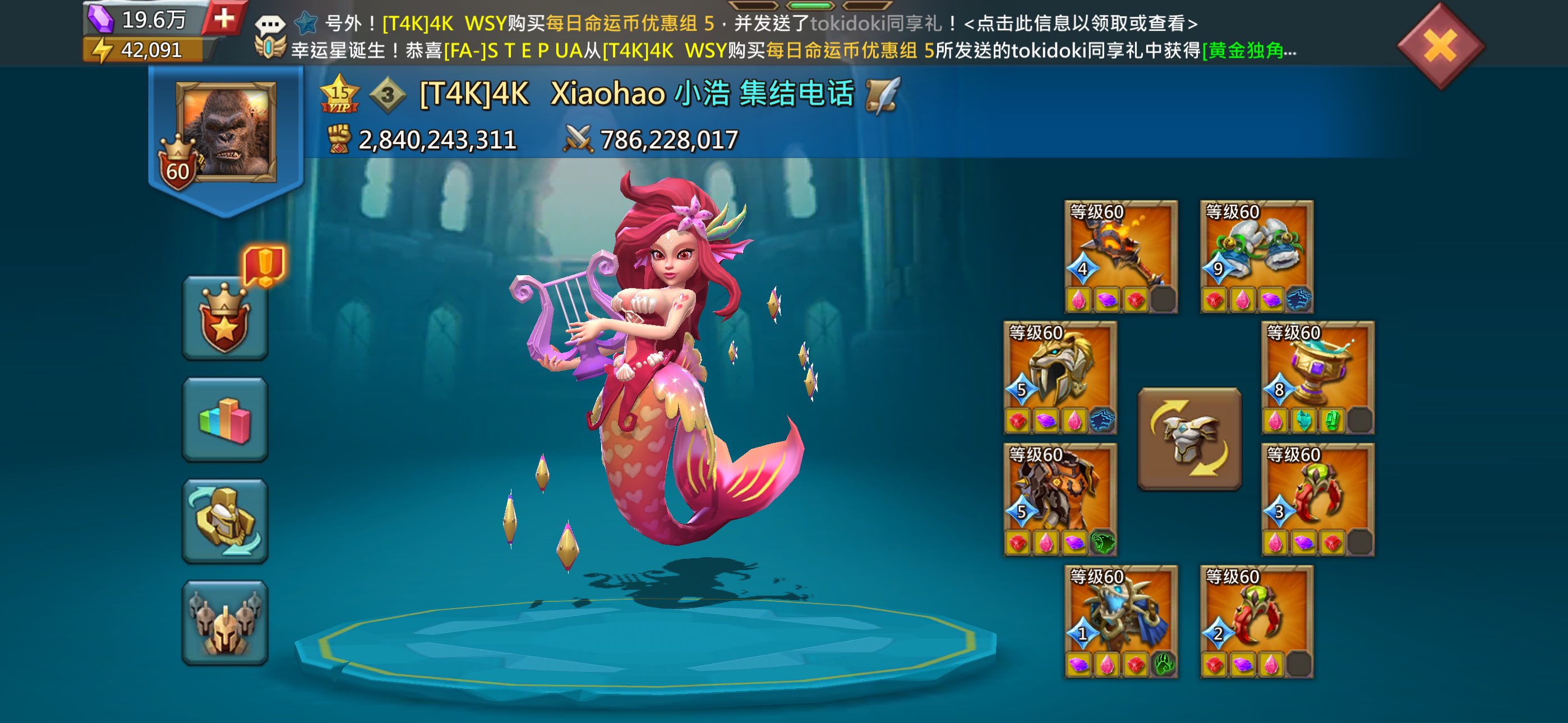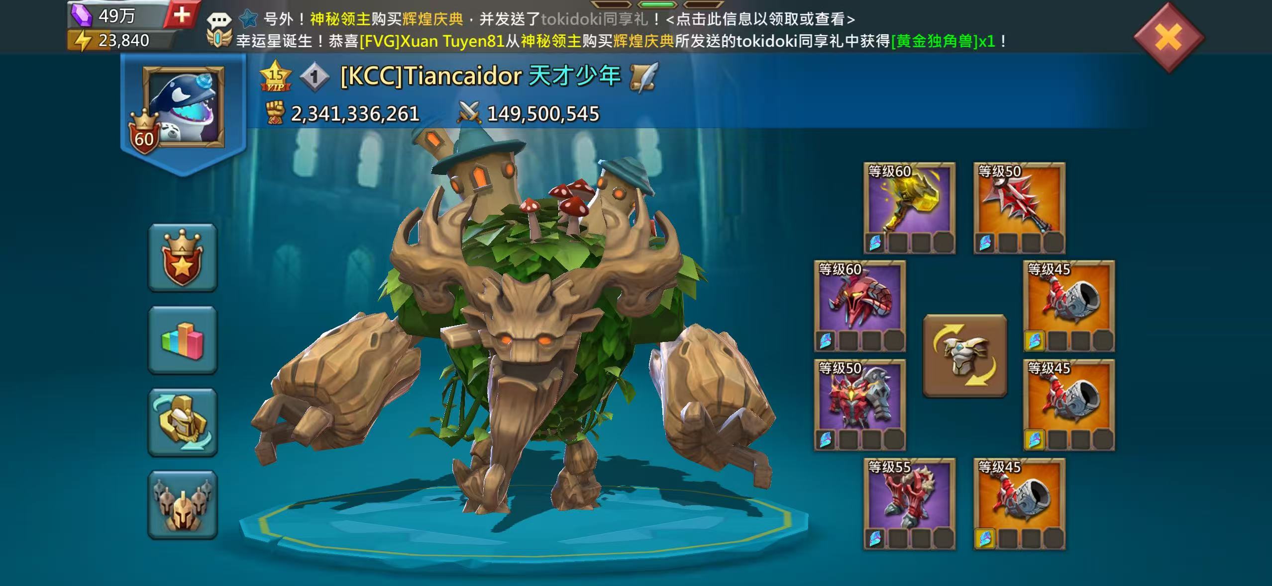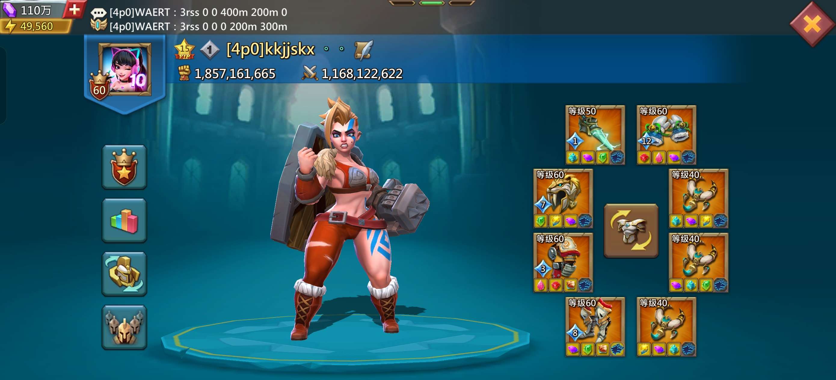 1.1亿兵,24.6亿战力,已开通送礼。三平500,有t5