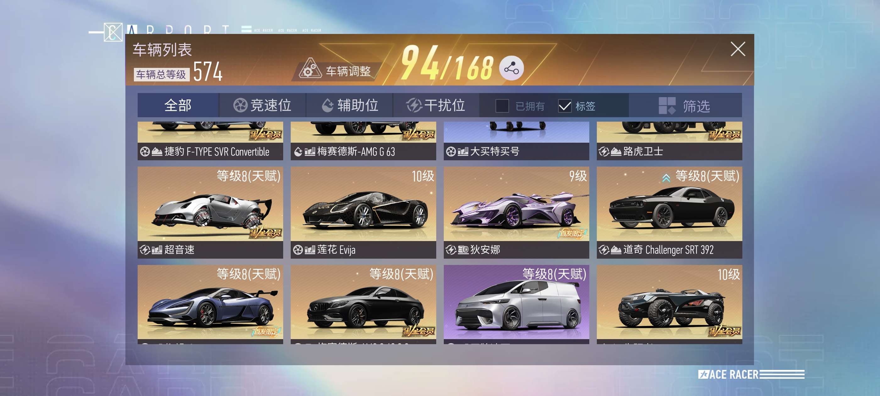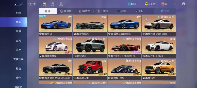 王牌竞速【安卓OPPO】141辆车 补给池还有8个冷门车没有 其他全满级 还有辆塞纳 还有臻彩飞饰 轮毂很多 两个按键