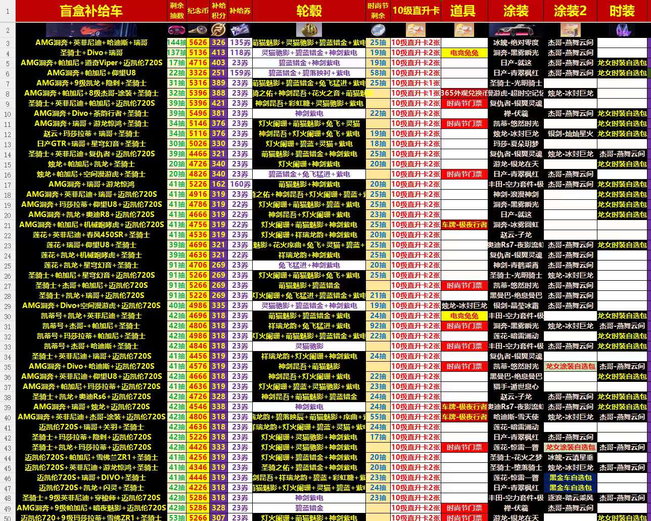 1800级,2辆珍宝女武神+莱肯,49辆补给车,大量传说皮肤轮毂,金色时装,红色换装动作,2个操作台