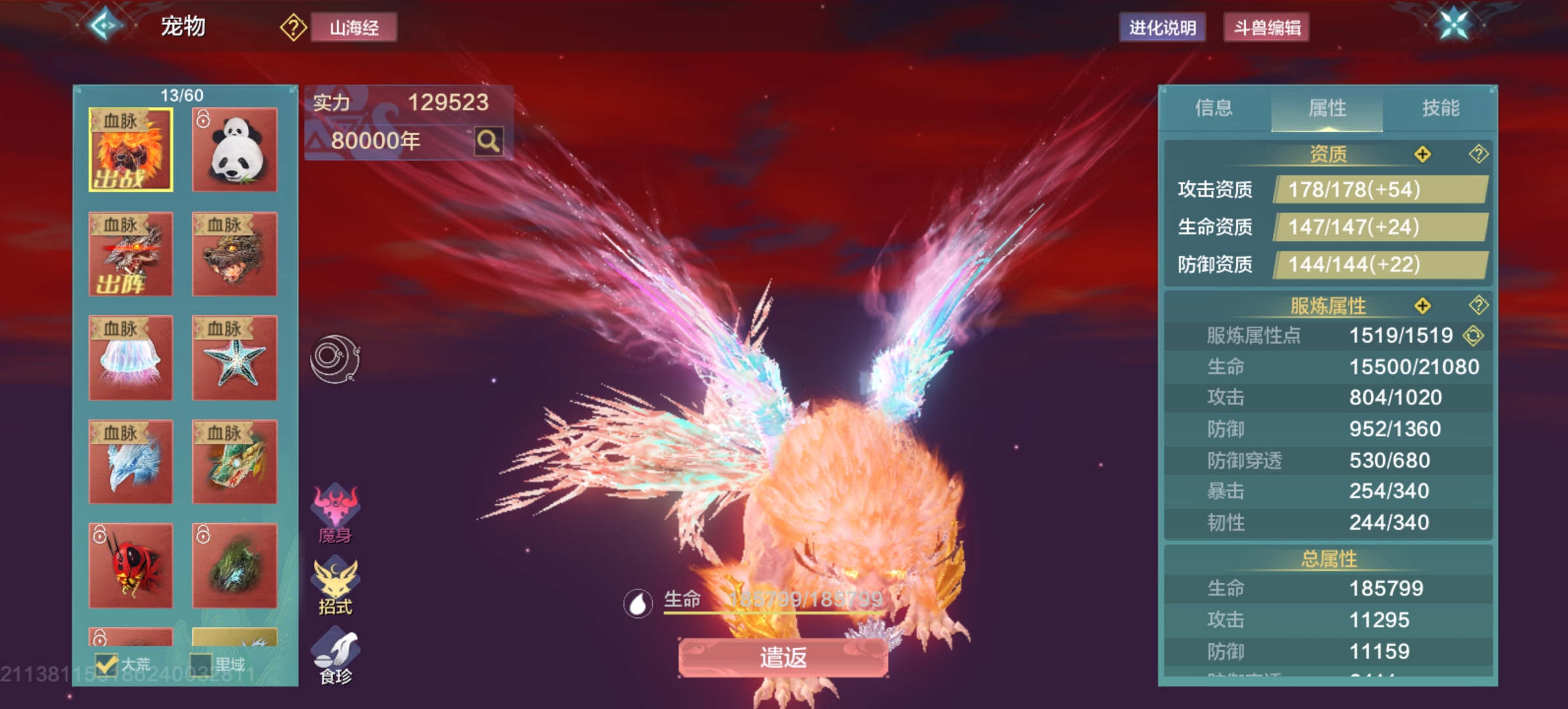 13万战力,7个五万年宠物,(穷奇 白泽 霸下 狴犴 螭吻 睚眦 熊猫),侍从小阿鼓,空手30%加成