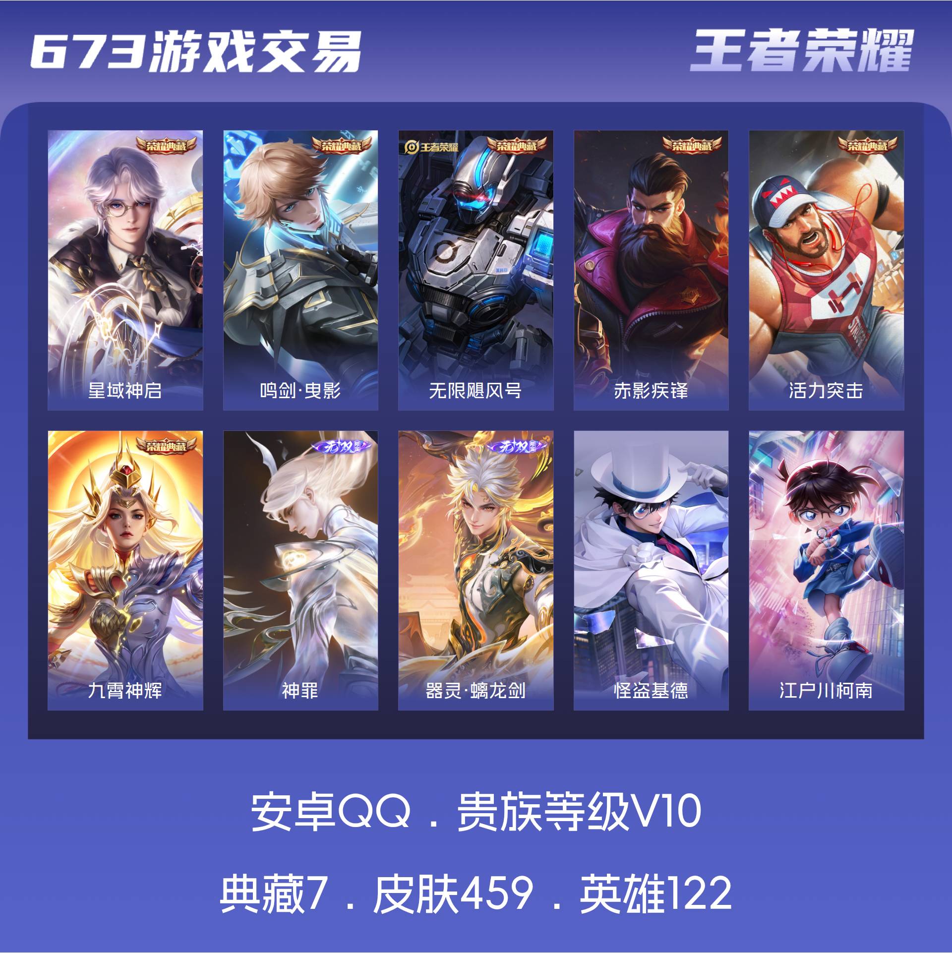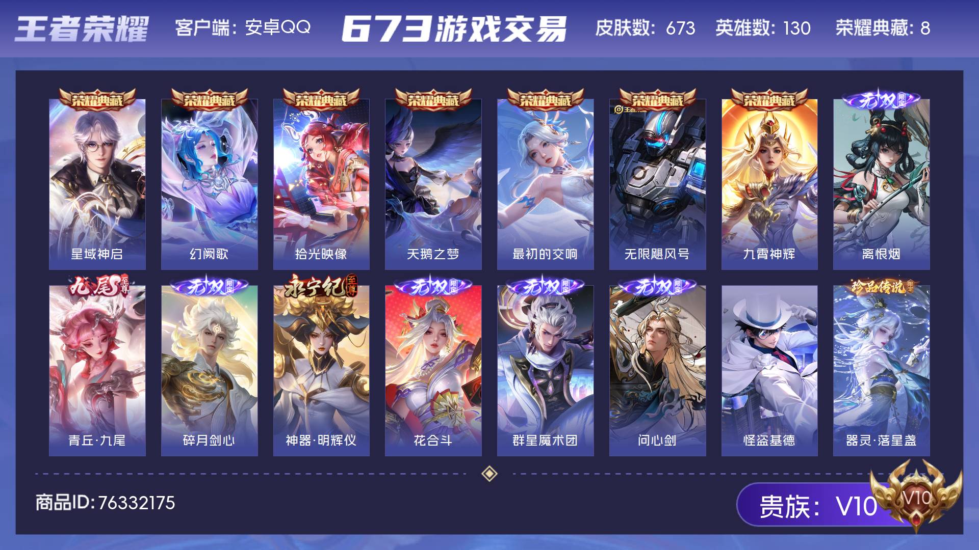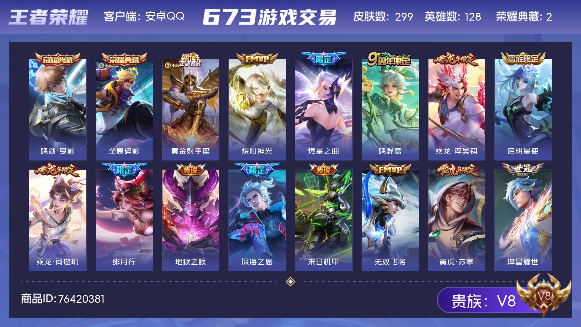 皮肤673 英雄130 至尊星耀 荣耀典藏8 无双皮肤7 珍品传说5 传说113-