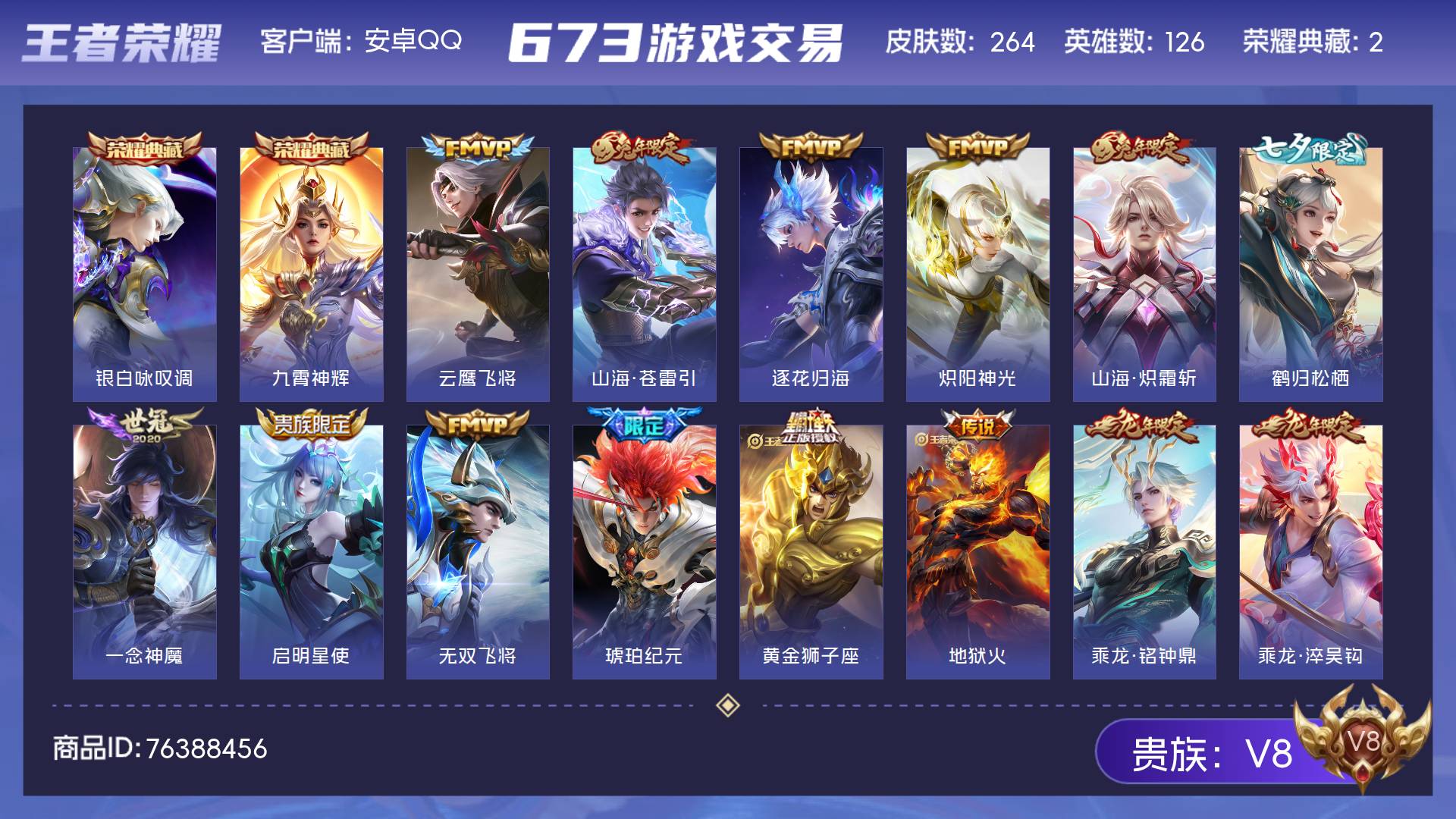 安卓QQ-可二次-V8 皮肤264 英雄126 至尊星耀 荣耀典藏2 传说20