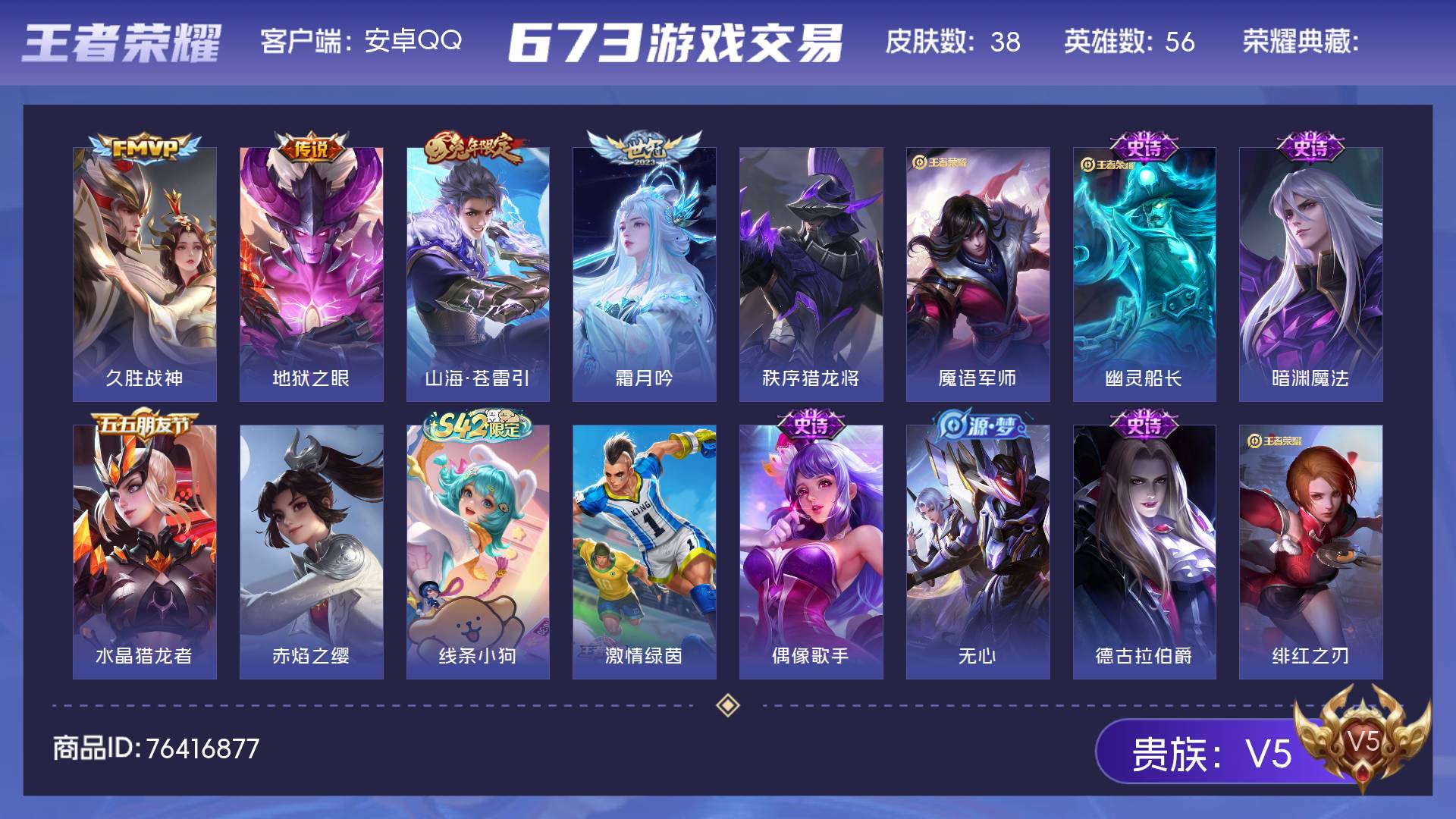 V5 皮肤38 英雄56 最强王者 传说4