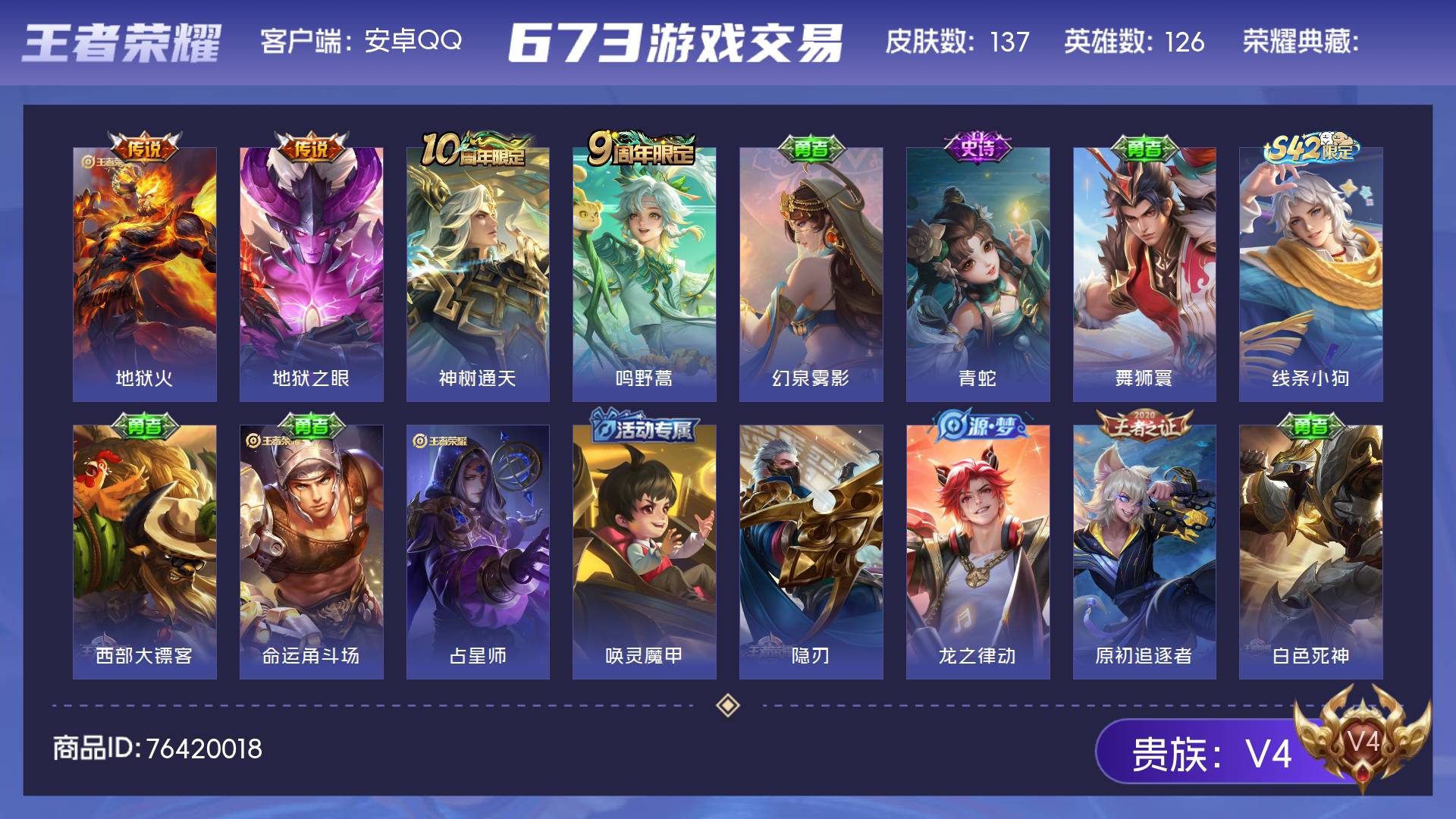 V4 皮肤137 英雄126 至尊星耀 星传说2 传说4