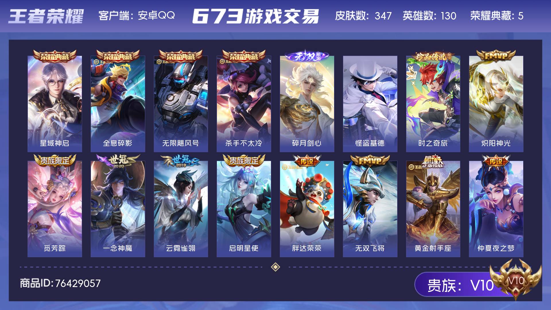 安卓QQ v10 皮肤347 英雄130 永恒钻石 荣耀典藏5 无双皮肤1 珍品传说2 传说19-6星元
