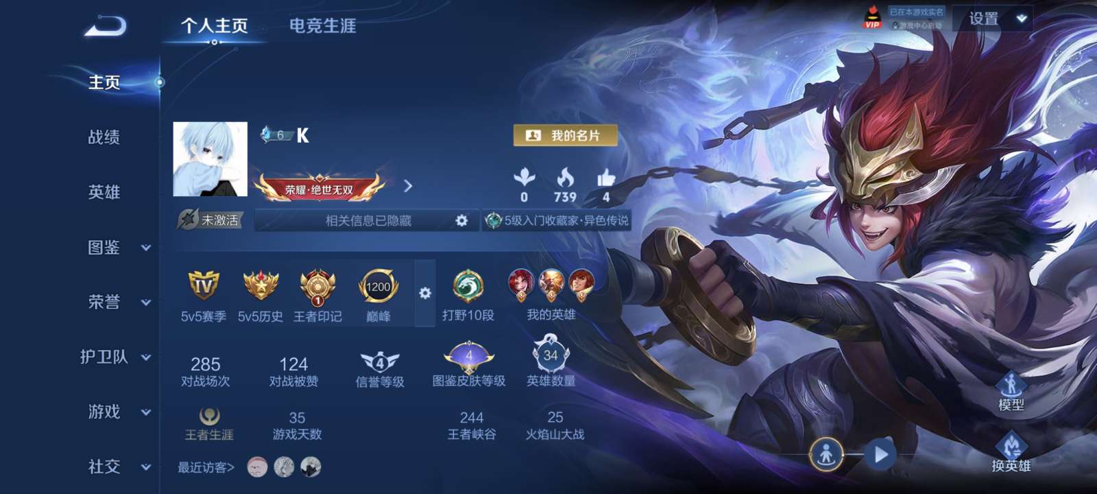 实名: 可修改 贵族等级: V5 英雄数: 106 皮肤数: 94 星传说: