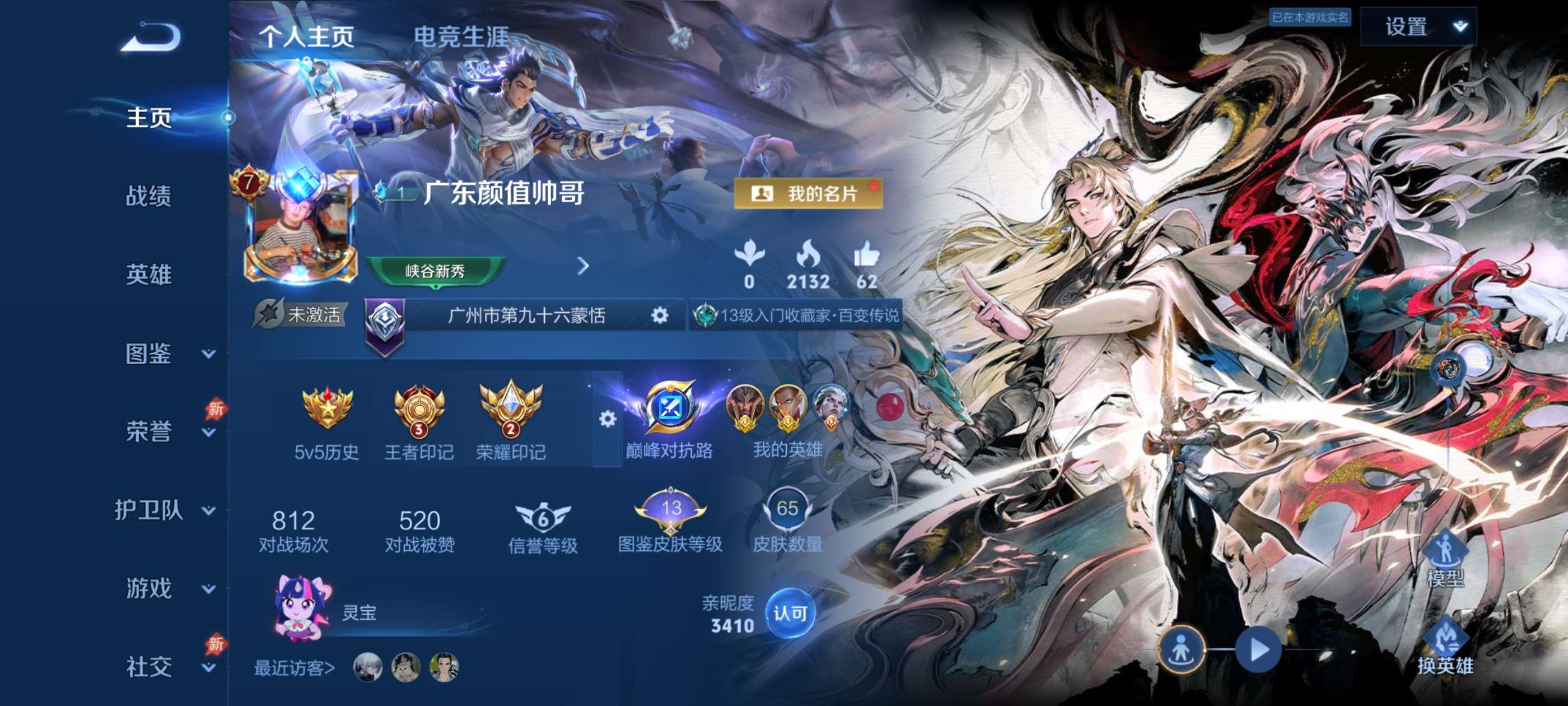 实名: 可修改 贵族等级: V8 英雄数: 128 皮肤数: 385 荣耀水晶