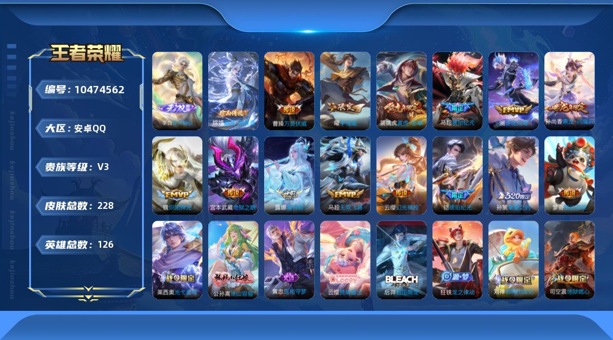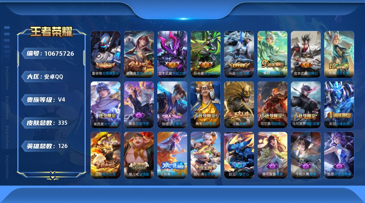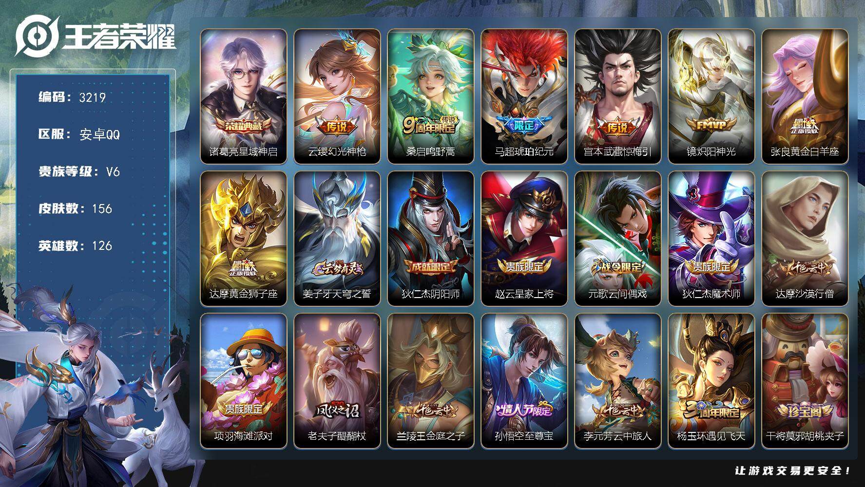 王者荣耀【安卓QQ】安卓Q-V6-最强王者段位-126英雄-156皮肤-1典藏-0珍品无双-0无双