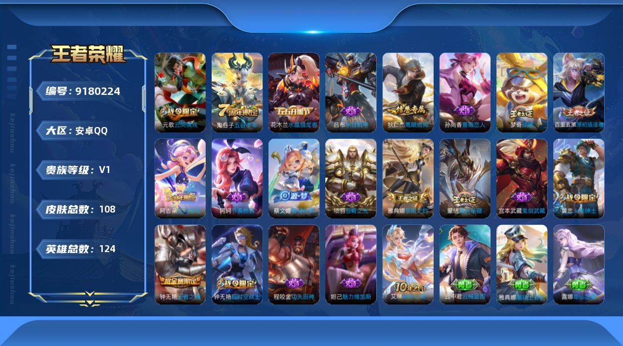 王者荣耀【安卓QQ】实名: 可修改 贵族等级: V5 英雄数: 108 皮肤数: 90 传说皮: