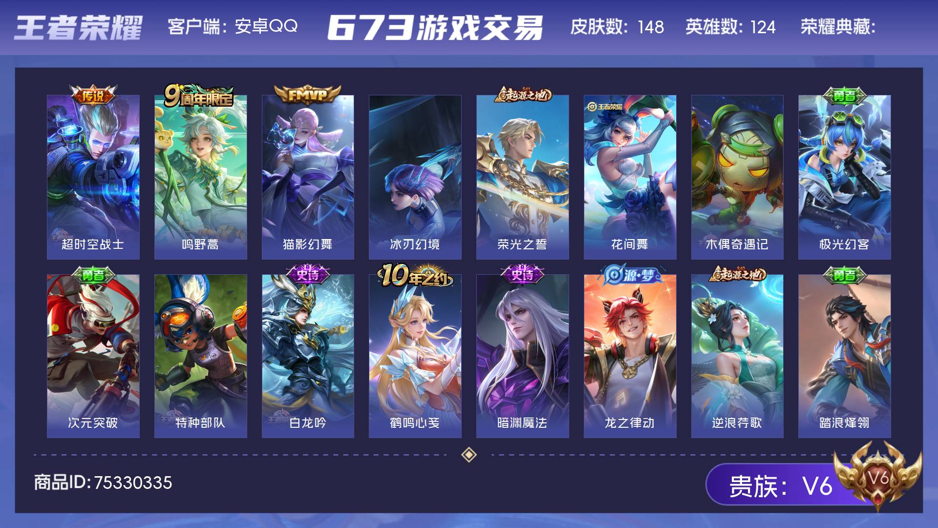 V6 皮肤148 英雄124 至尊星耀 传说3 其他皮肤149