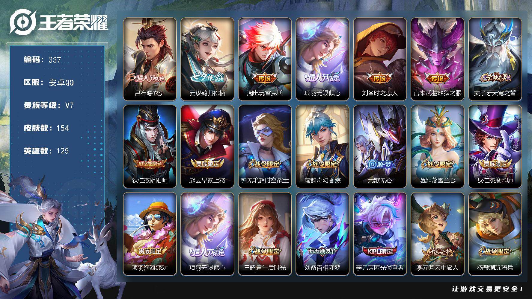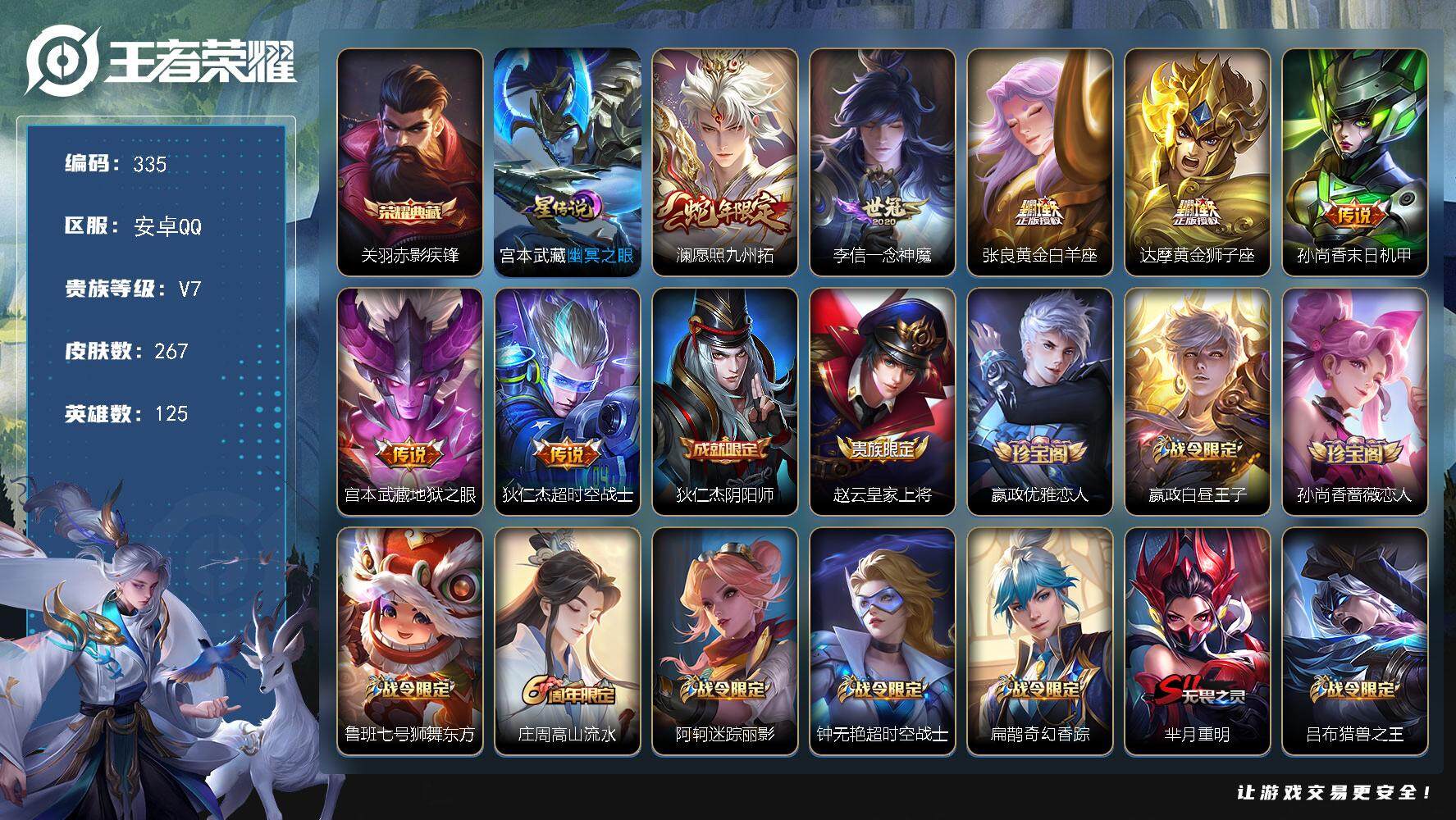 王者荣耀【安卓QQ】安卓Q-V6-尊贵铂金II段位-125英雄-267皮肤-1典藏-0珍品无双-0