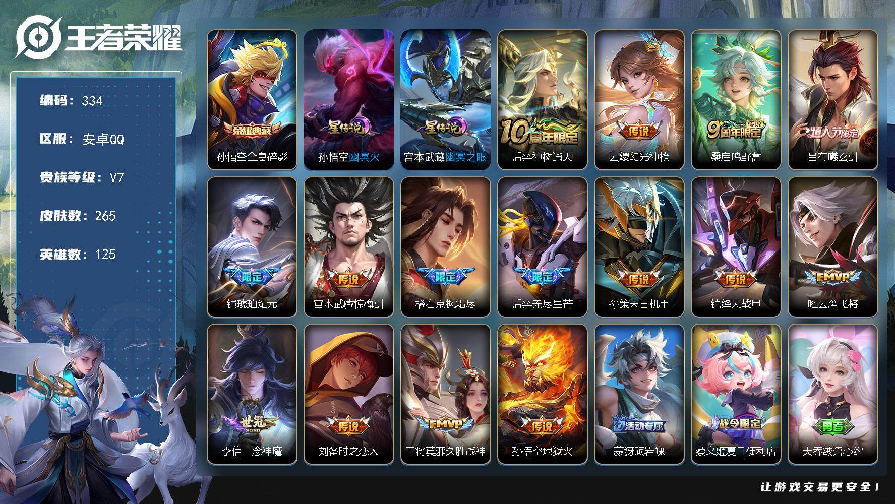 王者荣耀【安卓QQ】安卓Q-V7-265皮肤-1典藏-15传说-61史诗-2星传说 【英雄全皮】: