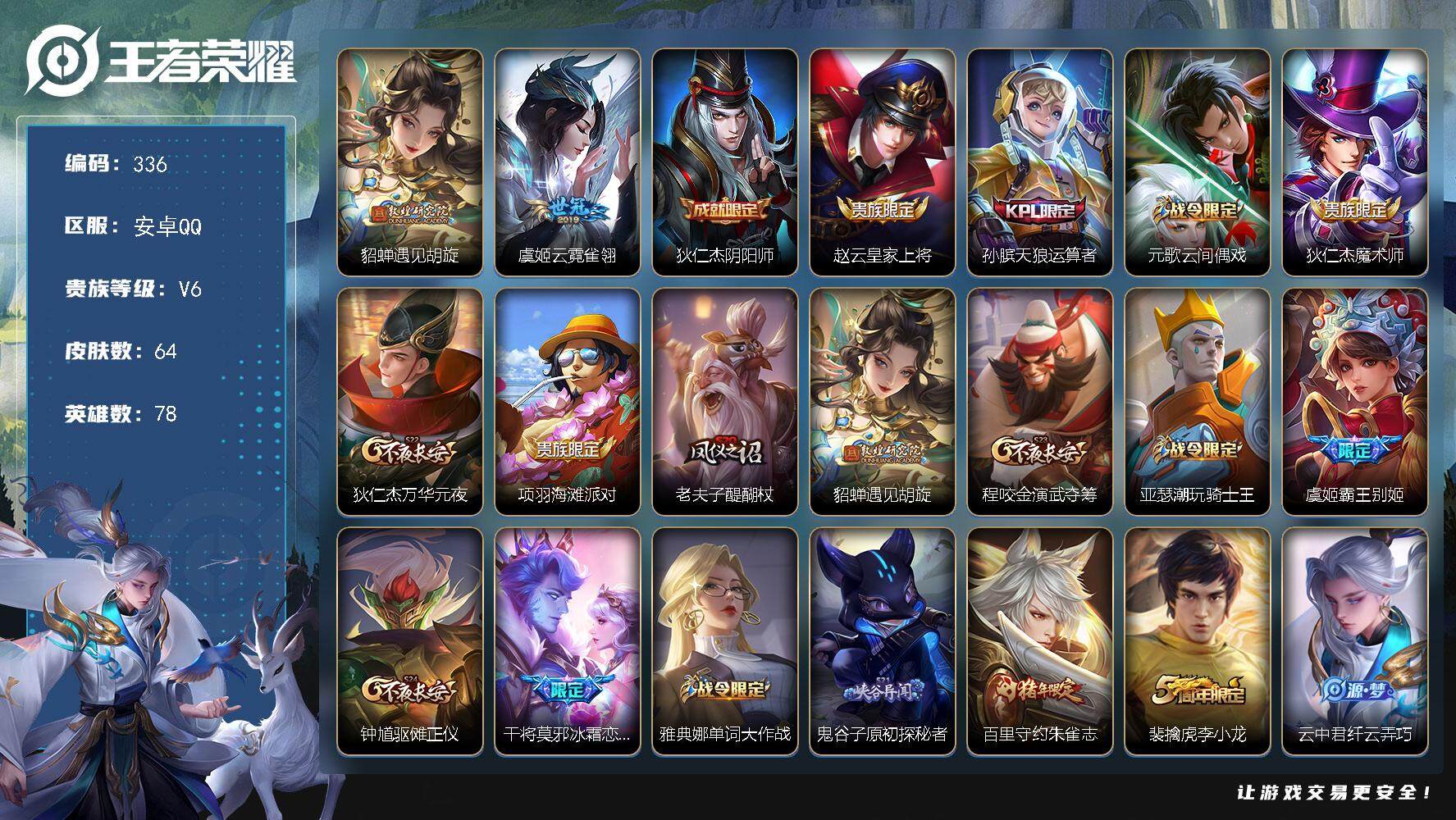 王者荣耀【安卓QQ】安卓Q-V6-最强王者段位-78英雄-64皮肤-0典藏-0珍品无双-0无双-0