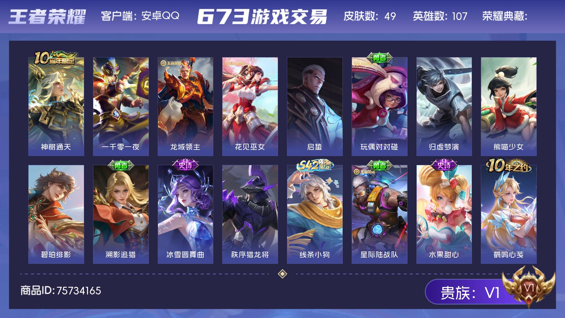 V1 皮肤49 英雄107 永恒钻石 传说1 其他皮肤54