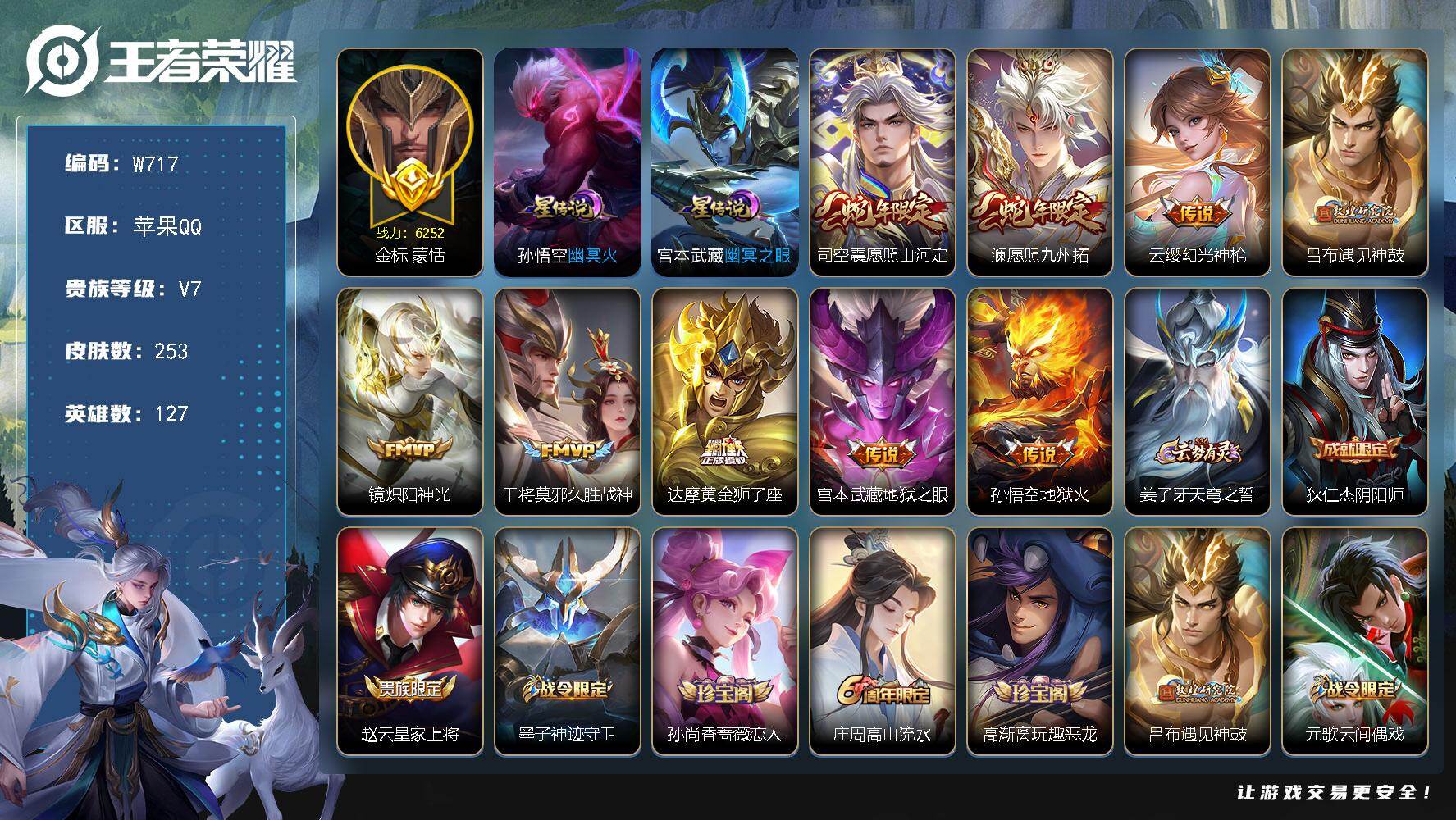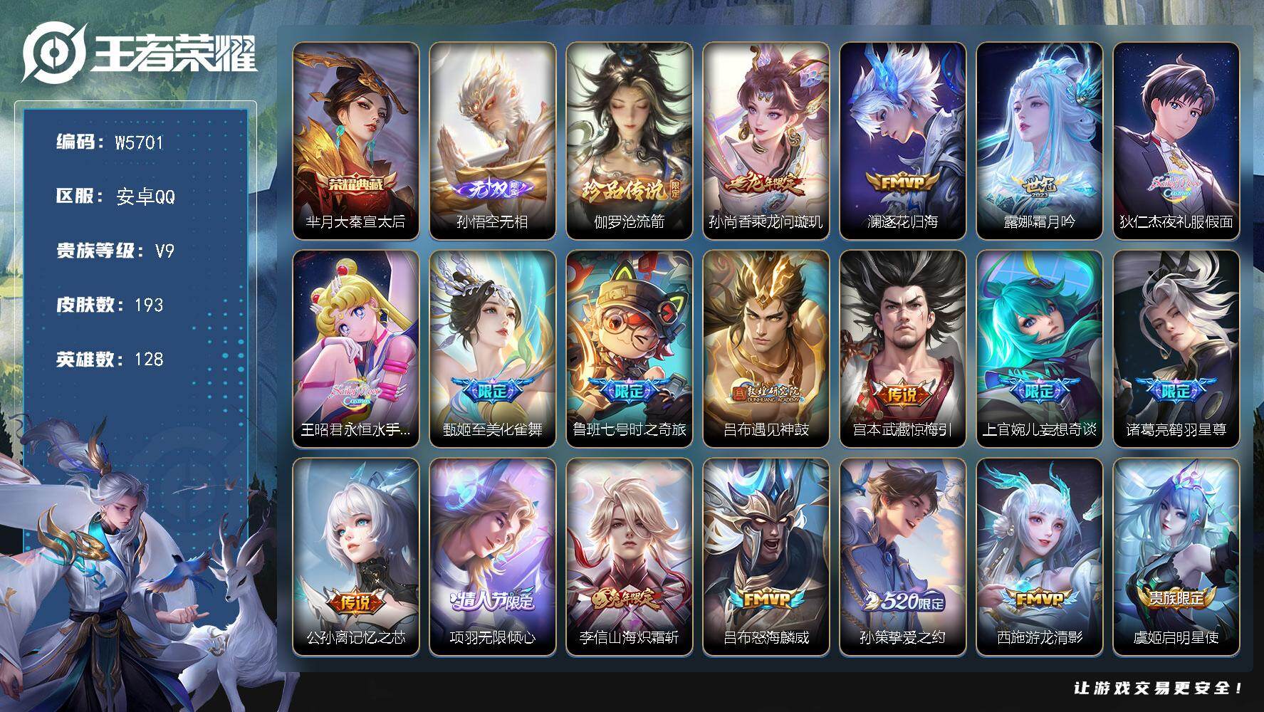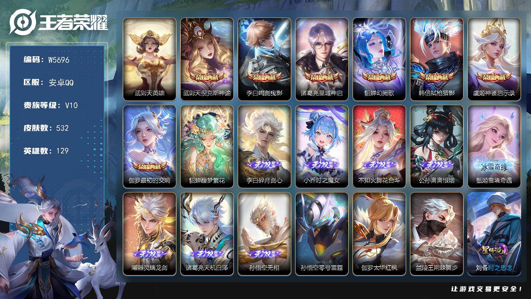 【W5701】极品低场次开局号(热门皮肤)无相.大秦宣太后.白虎志.沧流箭.惊